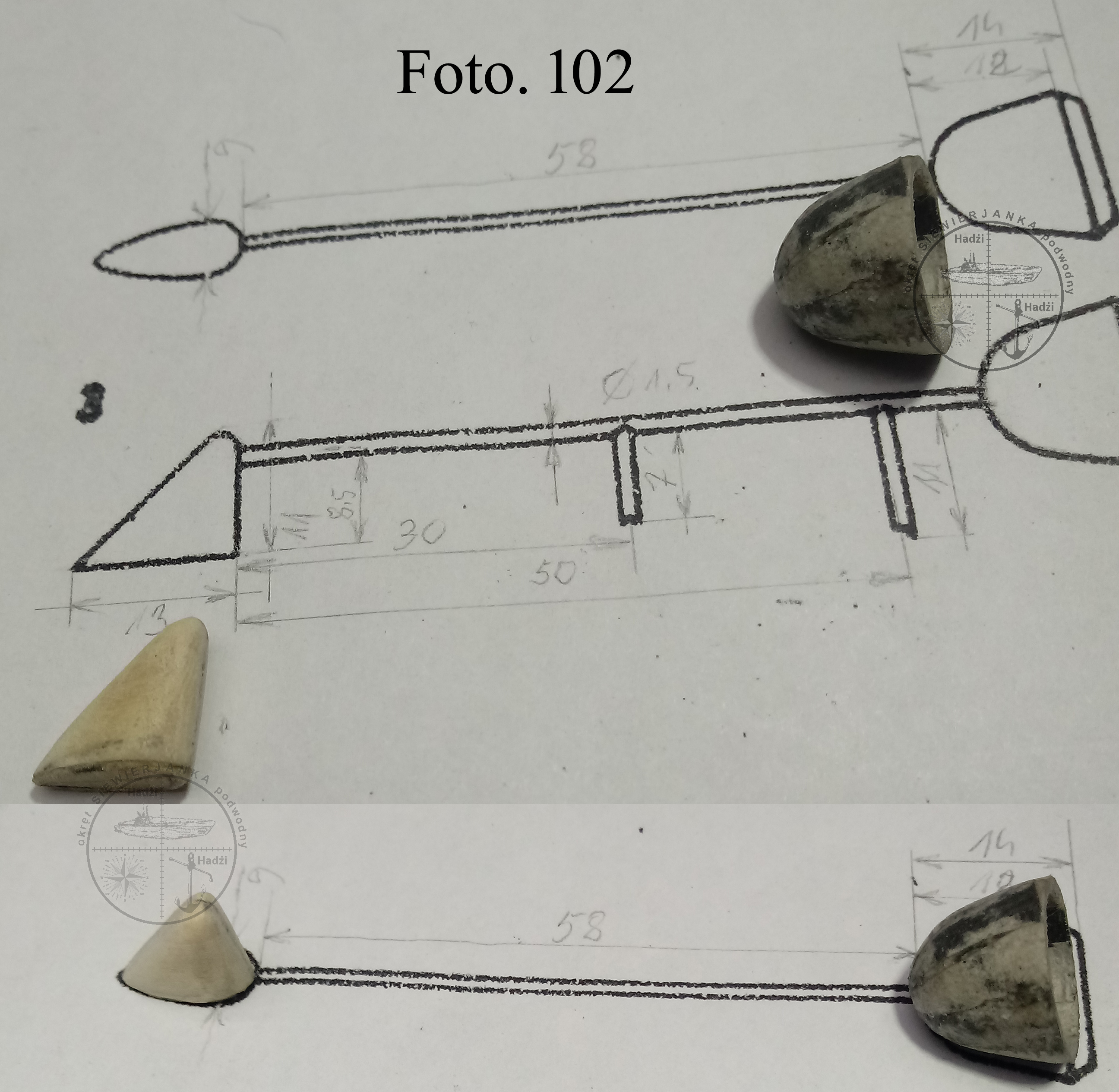 Przystąpiłem też do wykonania elementów reflektora dziobowego. Do wykonania obudowy reflektora zastosowałem tą samą metodę skorupową. Czyli najpierw wykonałem kopytko. Następnie nakleiłem dziesięć warstw pasków gazetowych i powstała skorupa po zdjęciu z kopytka. Widok przedstawia foto. 101.