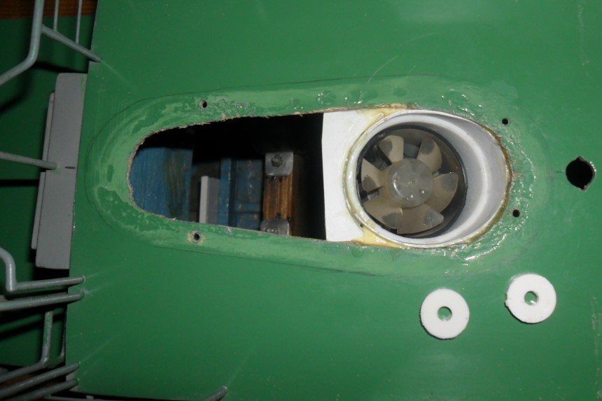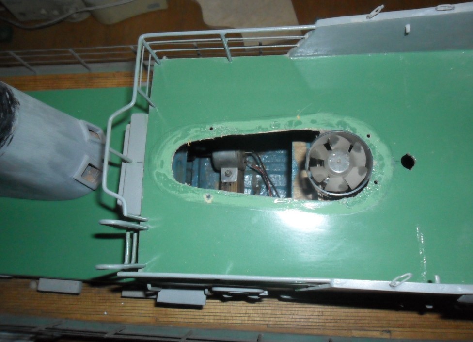 Witam,coś tam podłubałem,jako,że silniki są starego typu,krótkie,więc montaż chłodzenia trochę by się mijał z celem, a komin ma wloty i wyloty powietrza postanowiłem wykonać nadmuch powietrza do wnętrza modelu.zamontowałem silnik z propelerkiem .Troszkę się boję wbijania wilgoci w środek ,ale nie będę przecież pływać w sztormowej pogodzie a trochę schłodzę silniki i regulator no i będzie dodatkowe żródło szumu imitujące choć trochę prace okręciku,do następnej odsłony,pozdrawiam Marek