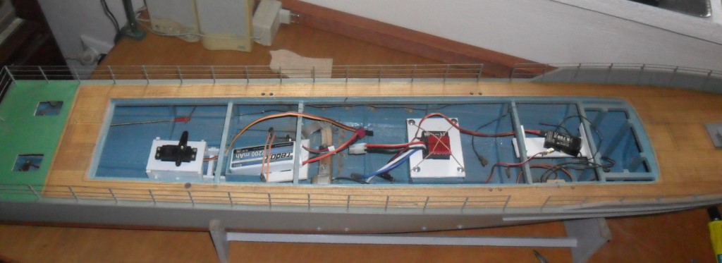 Witam,odnawiam,stary model zbudowany w 1974 roku,wodowany 1985,poprzednio pływał z aparaturą Pilot 2.Parę lat temu chyba w 2010 prawie wszystko udało mi się zdemontować dostał nowe malowanie,obecnie tylko retuszowane i odświerzane.Aparatura Graupnera siedmio kanałowa,regulator 40A Graupnera,Obecnie ma stare silniki jeszcze ze Składnicy Harcerskiej ok 380 ,Sruby lutowałem sam na przyrządzie z Modelarza,Linaia wału, rurka z tulejami fosforobrązowymi Na razie silniki i sruby pracują przyzwoicie,W przyszłym tygodniu próby morskie.,pozdrawiam Marek