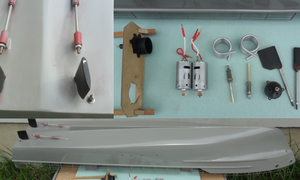 Witam,są małe postępy,małe ,w końcu udało mi się jakoś pozamykać pory po żywicy ,podkład i farba docelowa :poliuretan dwuskładnikowy malowałem aerografem,ale malował będę jeszcze raz,ponieważ przedtem malowałem pędzlem bez utwardzacza i nie bardzo mogłem doszlifować powierzchnię, ciągnęło się to jak olejnica. .Myślę ,że po wyschnięciu i utwardzeniu się farby uda mi się lepiej przygotować powierzchni e do malowania,Na końcu i tak chcę wszystko wypolerować.Są elementy składowe napędu i układu chłodzenia,Musiałem obciąć narożniki steru aby zmieściły się czerpnie wody chłodzącej ,wlutowałem zębatki przekładni ,jest nowe łoże silników z przekładnią.Joker ,dziękuję za pomoc ,zapisałem ,nie wiadomo co się kiedy może przydać,jestem starej daty zbieraczem wszystkiego,pozdrawiam Marek