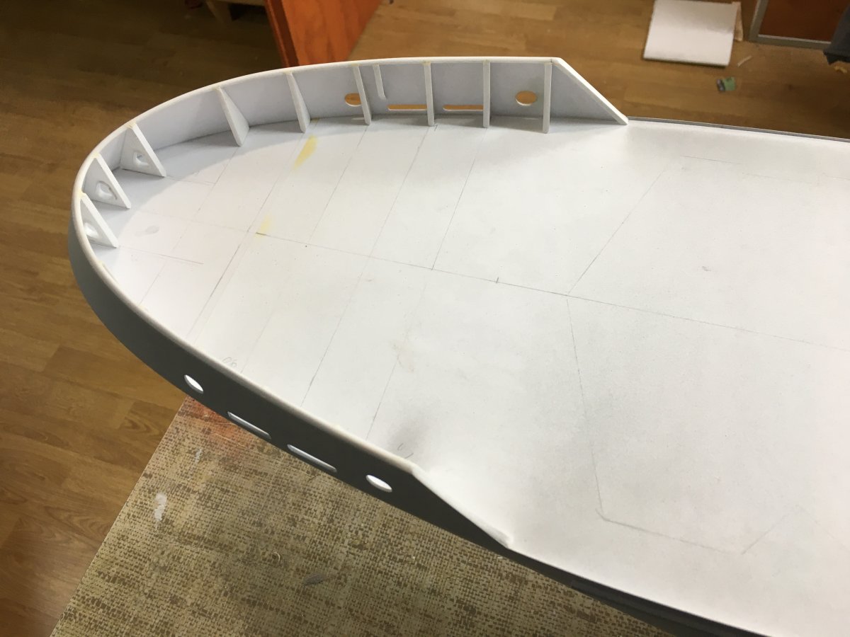 Pogoda za oknem paskudna za to sprzyja modelowaniu, walczę nadal z kadłubem, powierzchnia wyprowadzona jest już prawie na „glanc ”choć jeszcze sporo pracy zanim będzie gotowy pod malowanie. Wklejona listwa wzdłuż dziobu , wszelkiego rodzaju odpływy , wypływy , na rufie zrobiony slip do łodzi ratunkowej , pokłady główne tez już wklejone . Krzysiek Gdański wypalił mi przepięknie zamknięcia dennych studzienek poboru wody , jakość wypalenia w preszpanie jest rewelacyjna . Teraz przyjdzie czas na nadburcie oraz rant wokół pokładu oraz mocowania obijaczy na burtach.