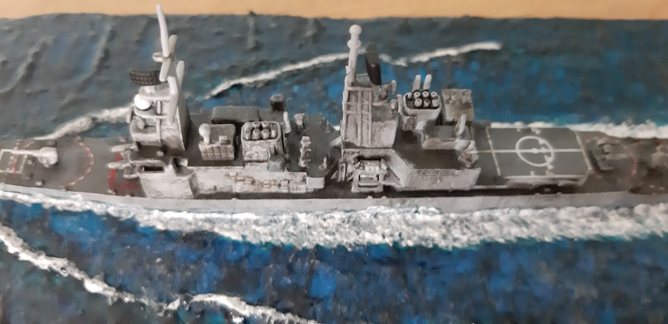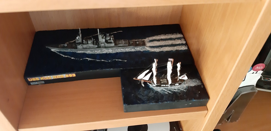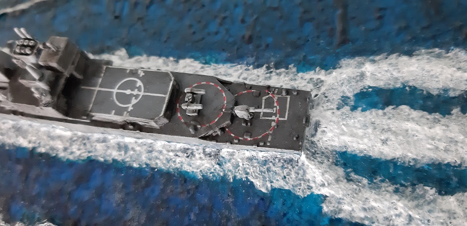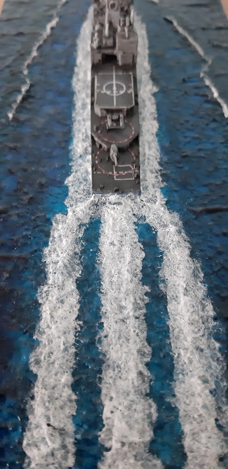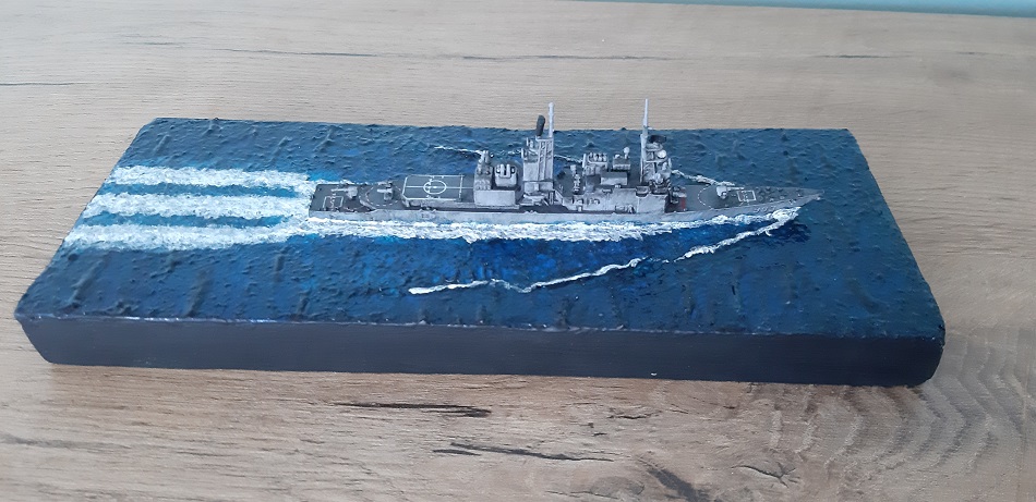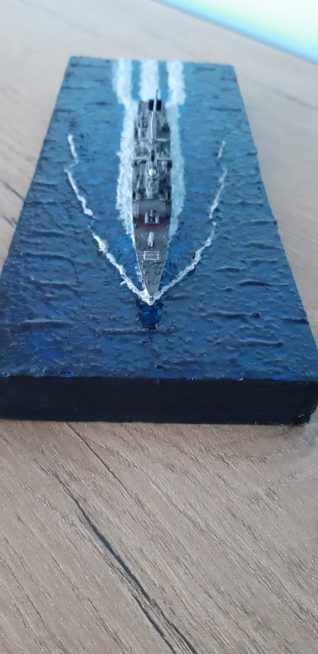 Ukończyłem budowe modelu wyżej wymienionego. Spasowanie bardzo dobre, klejenie czysta przyjemność (tamiya extra thin+revell contacta). Malowane było pierw podkładem w sprayu, potem bazowy pędzelkiem, lakier połysk w sprayu, kalki (tamka mark fit), połysk, wash, mat w sprayu wash do pokładu i na koniec znowu lakier matowy. Jako podstawkę posłużył mi odpad płyty wiórowej, oklejona balsą, by zamaskować strukturę płyty, przed malowaniem pokryłem górną część szpachlą do drewna. Do imitacji wody posłużyły mi farby akrylowe (modelarskie jak i dla plastyków) i efekty AK i still water vallejo. Z efektu jestem zadowolony choć jestem świadom, że dało się to zrobić lepiej. Ale biorąc pod uwagę, że jest to dopiero moja 2 dioramka morska w życiu i 3 plastikowy okręt z kolei myślę, że jest ładnie.