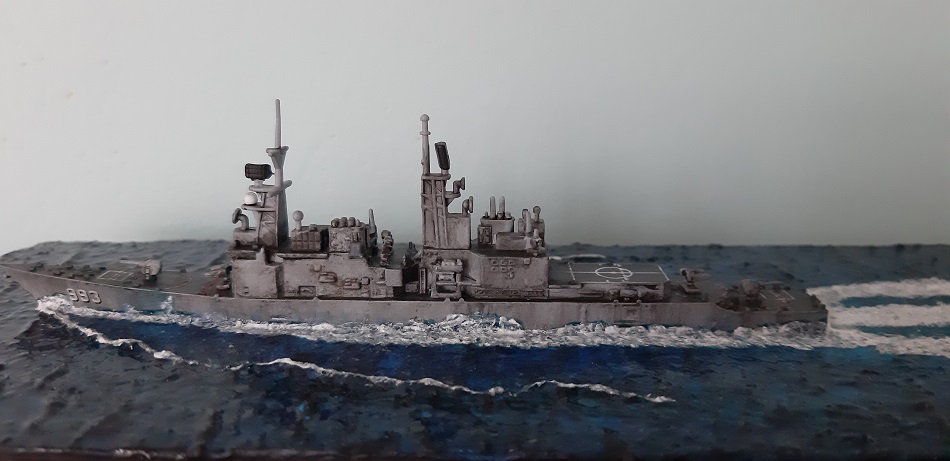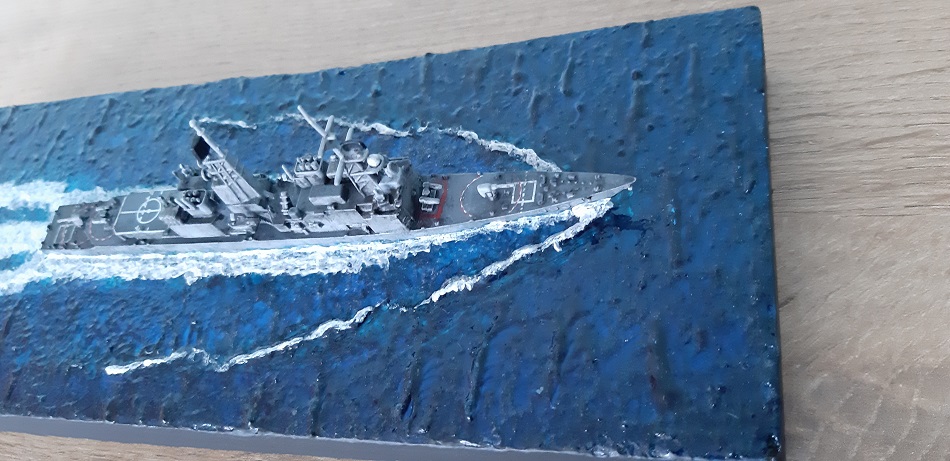 Ukończyłem budowe modelu wyżej wymienionego. Spasowanie bardzo dobre, klejenie czysta przyjemność (tamiya extra thin+revell contacta). Malowane było pierw podkładem w sprayu, potem bazowy pędzelkiem, lakier połysk w sprayu, kalki (tamka mark fit), połysk, wash, mat w sprayu wash do pokładu i na koniec znowu lakier matowy. Jako podstawkę posłużył mi odpad płyty wiórowej, oklejona balsą, by zamaskować strukturę płyty, przed malowaniem pokryłem górną część szpachlą do drewna. Do imitacji wody posłużyły mi farby akrylowe (modelarskie jak i dla plastyków) i efekty AK i still water vallejo. Z efektu jestem zadowolony choć jestem świadom, że dało się to zrobić lepiej. Ale biorąc pod uwagę, że jest to dopiero moja 2 dioramka morska w życiu i 3 plastikowy okręt z kolei myślę, że jest ładnie.