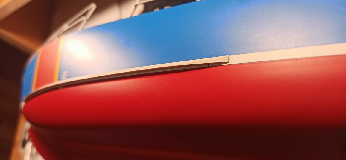 Wybrałem listewkę PVC 3x3mm ,o przekroju trójkątnym 90 stopni. Postanowiłem tak jak miałem w zamyśle dokleić ją wzdłuż linii wodnej powyżej załamania dna. To spowoduje złamanie fali i mam nadzieję że trochę pomoże…Po doklejeniu okazało się że jest ledwo widoczna i na dodatek powstał mimowolnie akcent „makietowy”. Teraz tylko woda i próby. Po tych zabiegach albo będzie lepiej albo nie. Zobaczymy.