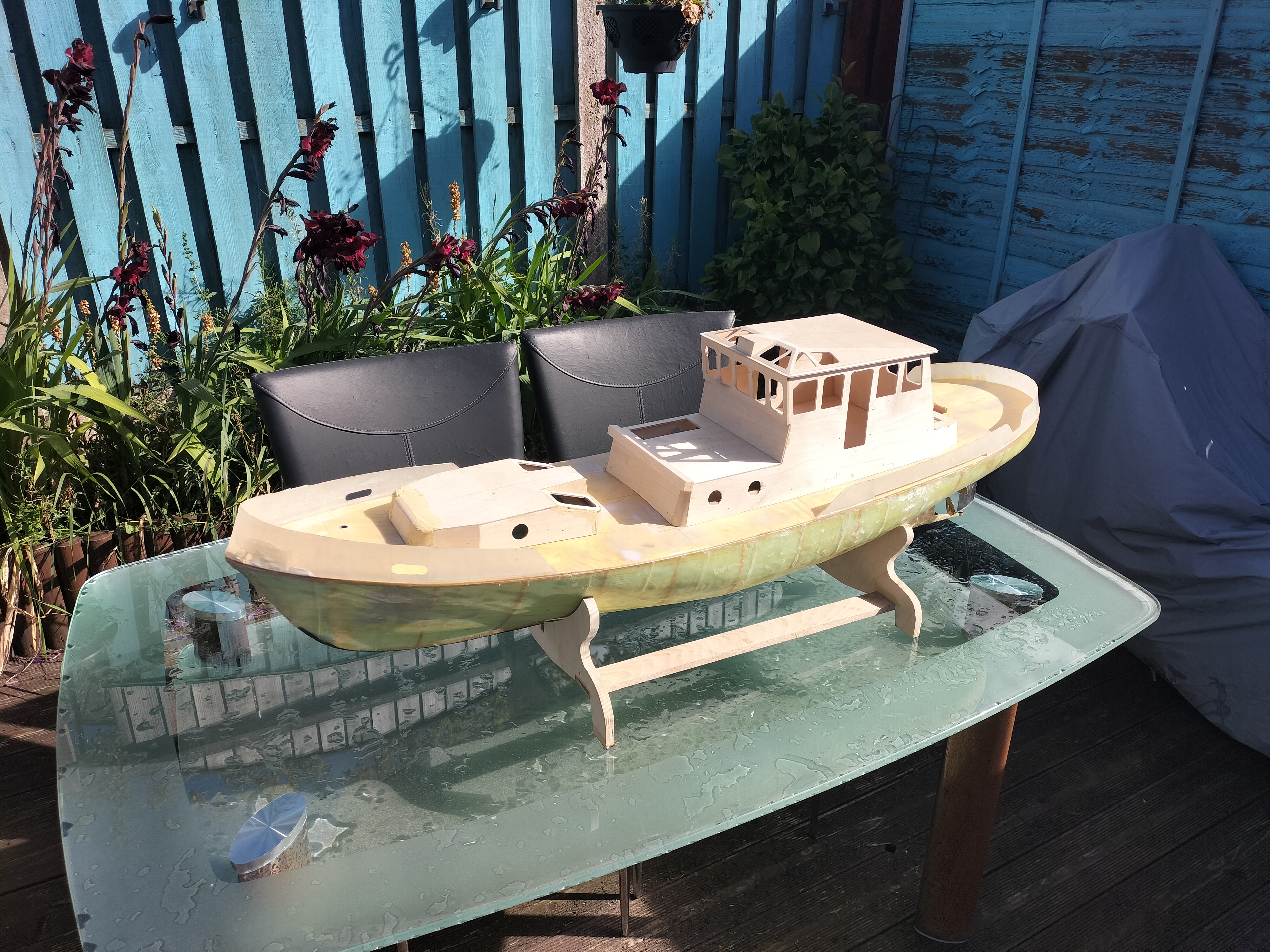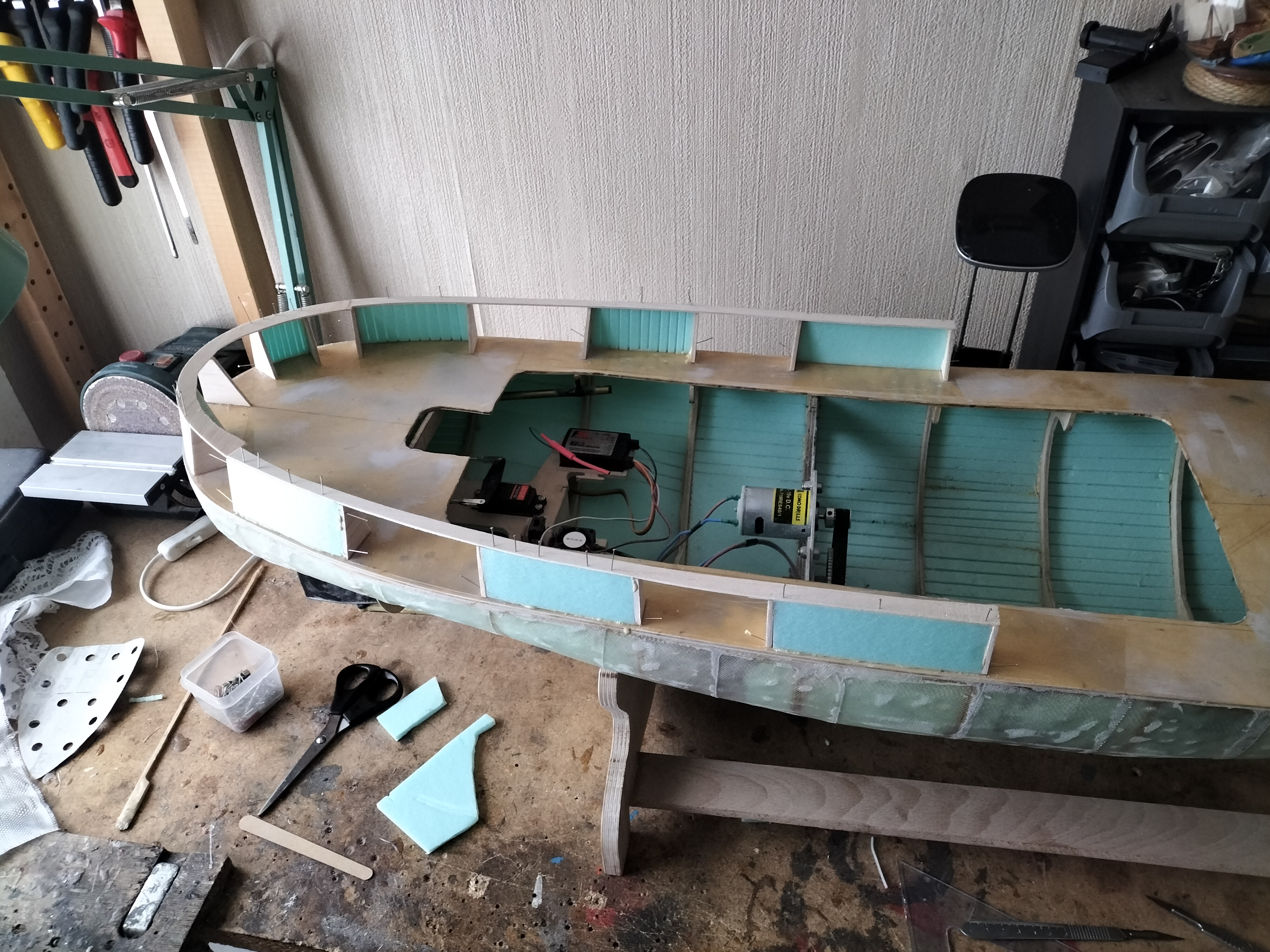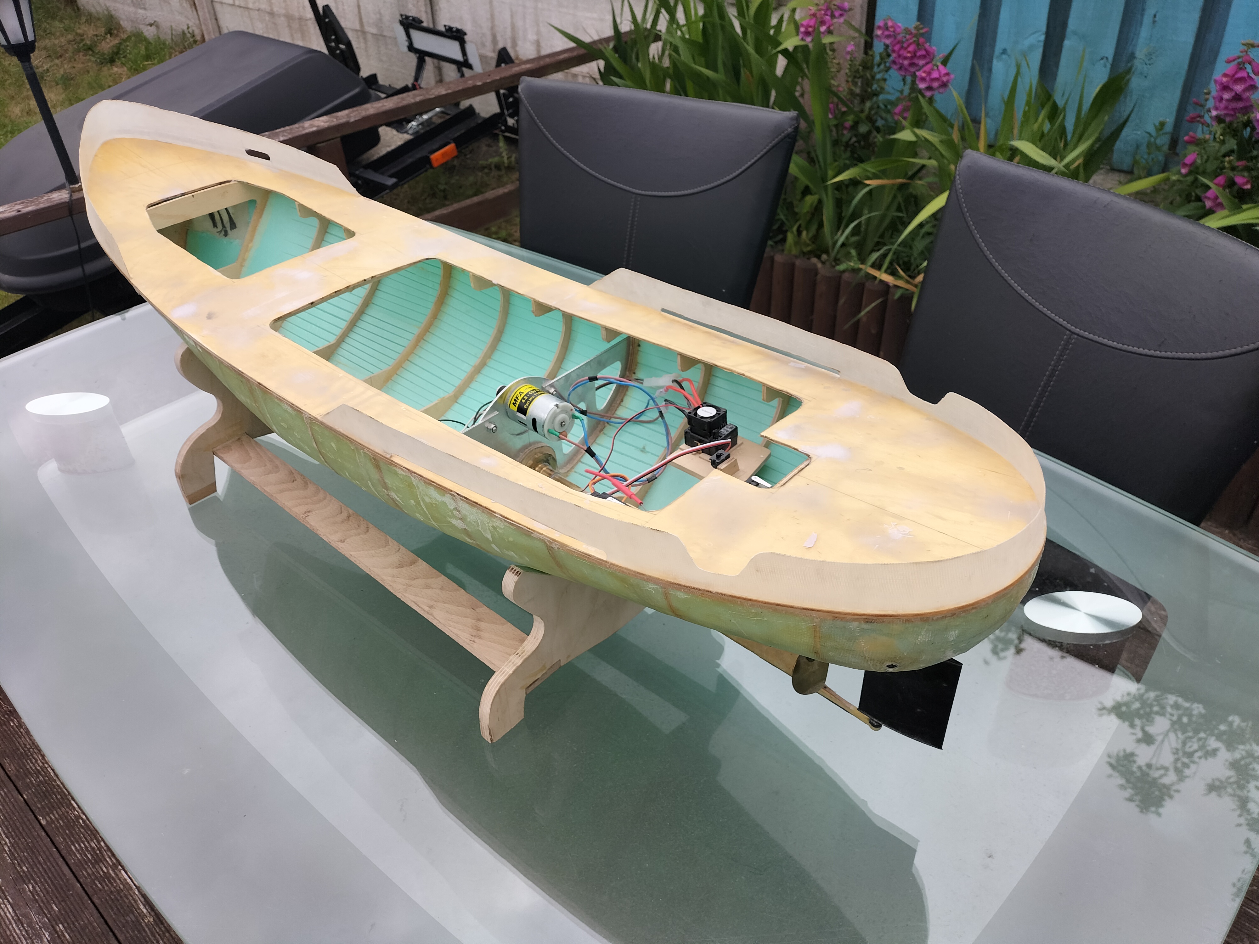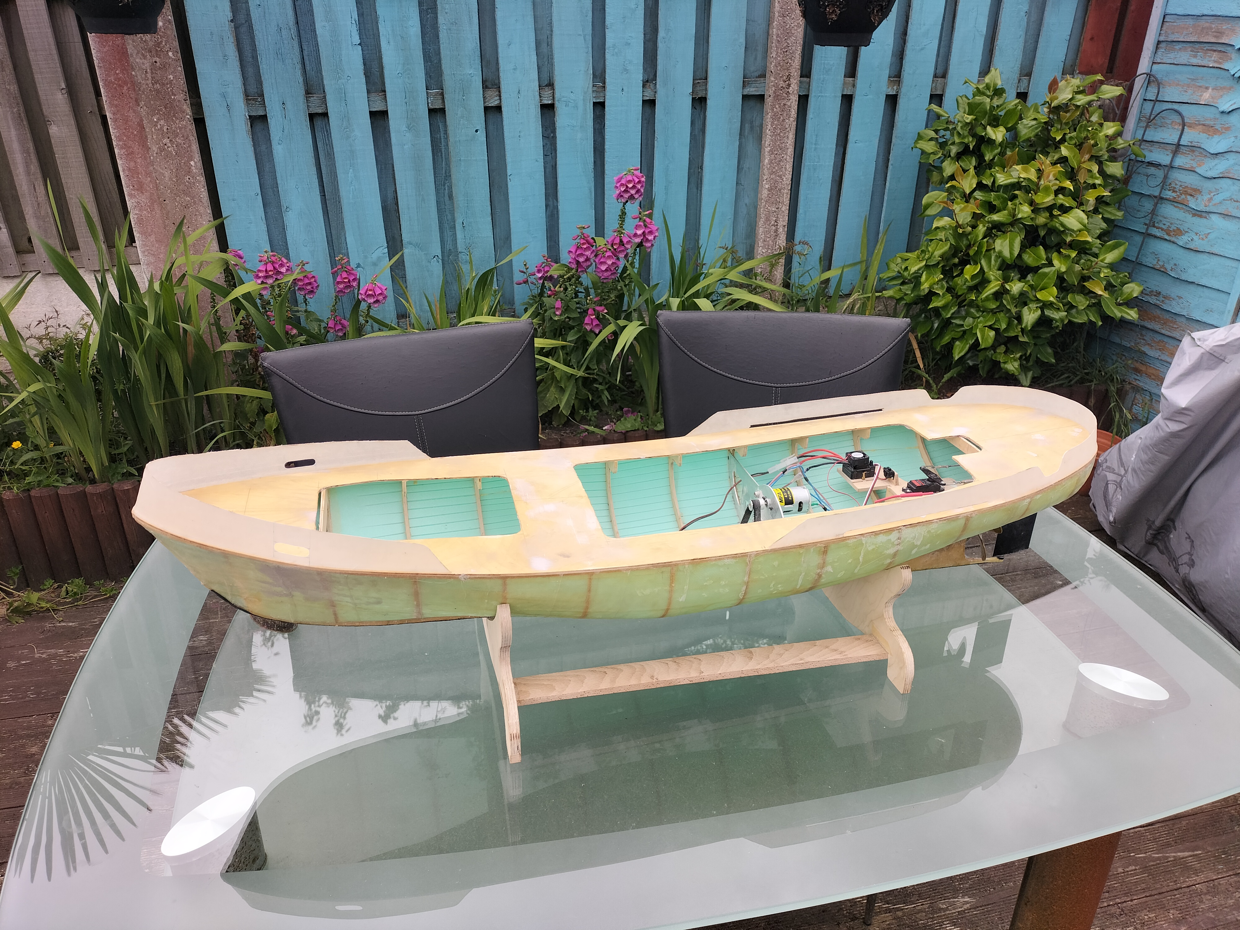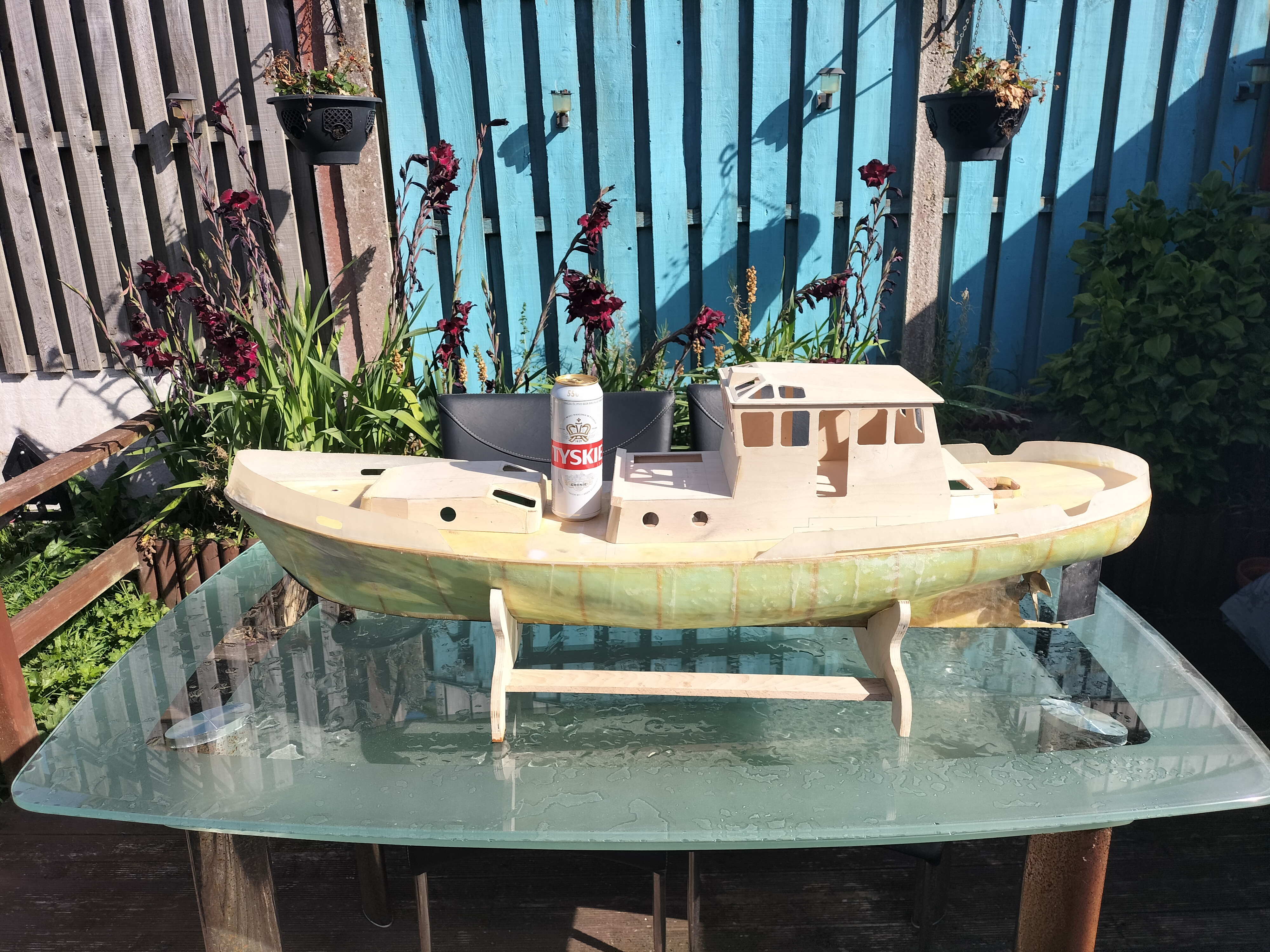 I dobrze. Potrzebny jest doping do pracy. Ale model buduję typowo hobbystycznie. Nie buduję na wyścigi, chociaż chciałbym skończyć przed przyszłym sezonem. Są niewielkie problemy ze zdobyciem w UK dobrej jakości materiałów. Chociażby sklejki 2 mm w odpowiednich arkuszach na nadbudówkę. Zakupiłem w Krośnie, a to pochłania czas na przesyłkę. Albo mnóstwo elementów elektryczno-elektronicznych z e-baya , a w zasadzie z Chin.