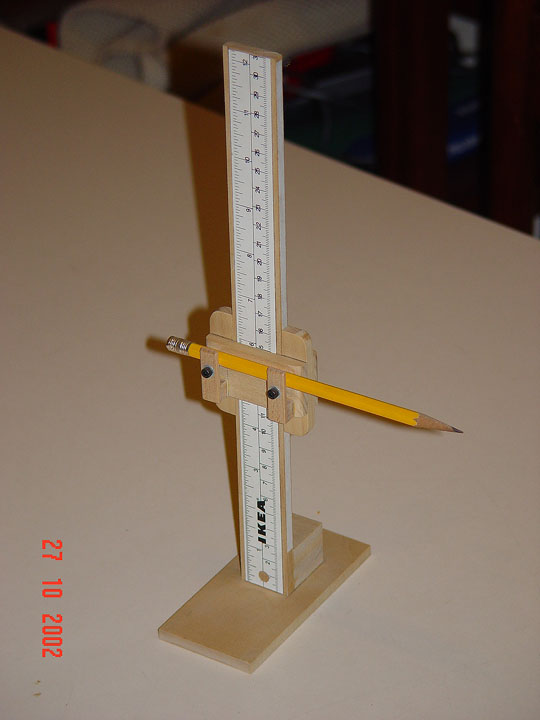 10 - na lezacej na stole listewce zaznacz ten odstep (w miejscu gdzie bedzie ona lezec na tej wredze), tj. w/w punkty krotszymi nozkami cyrkla, ukladajac jeden koniec igly jednej nozki tuz obok krawedzi listewki-planki, a druga nozke delikatnie wbijajac w listewke.