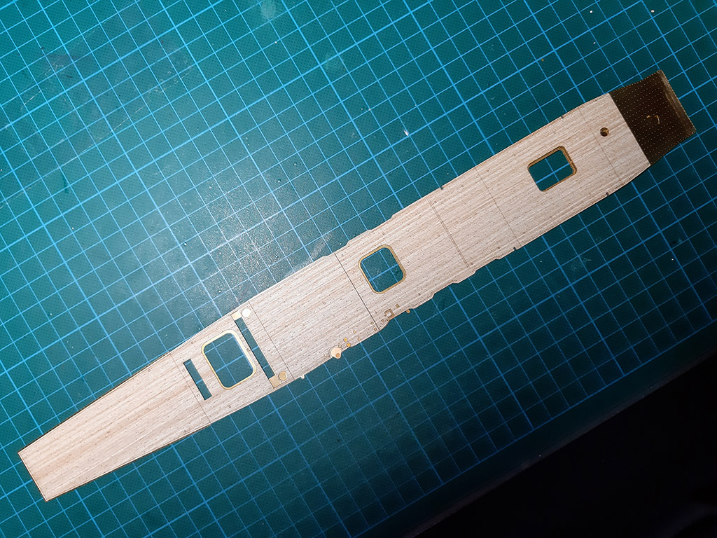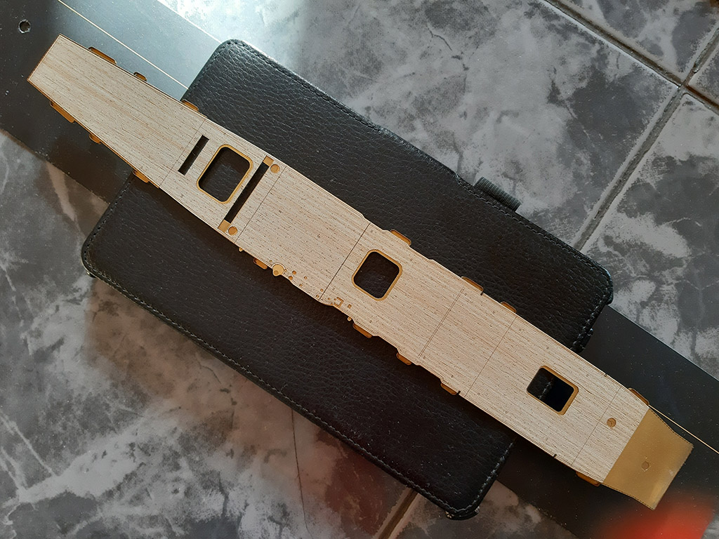 Pokład jest drewniany i składa się z cieniutkich listewek naklejonych na papier z klejem. Drewno wygląda na na bambus cieniutko krojony na listewki