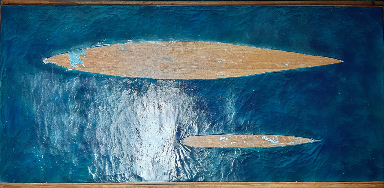 Jeżeli okręty są w ruchu to dobrze by było zrobić im fale dziobowe i rufowe. W teorii wygląda to jak na rysuneczkach. Zdjęcia nie zawsze dają pełen obraz bo większość fal nakłada się na siebie. Natomiast główne falowanie jest zawsze takie same i zależy tylko od prędkości jednostki. układ fal i ich kąt wykorzystywali lotnicy do określenia prędkości jednostek w konwoju. A wygląda to tak