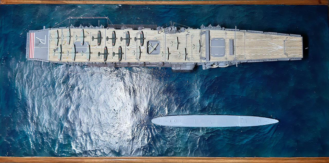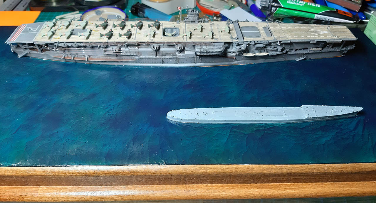 To jeszcze nie koniec relacji, gdyż siedemsetka bez morza jest jak ryba bez wody, więc będzie diorama. Akagi również nie może obyć się bez obstawy, osłania go pancernik - oczywiście Yamato, który jest zrobiony. Do kompletu dojdzie jeszcze niszczyciel Yukikaze klasy Kagero. Niszczyciel będzie na wspólnej dioramie z Akagi.