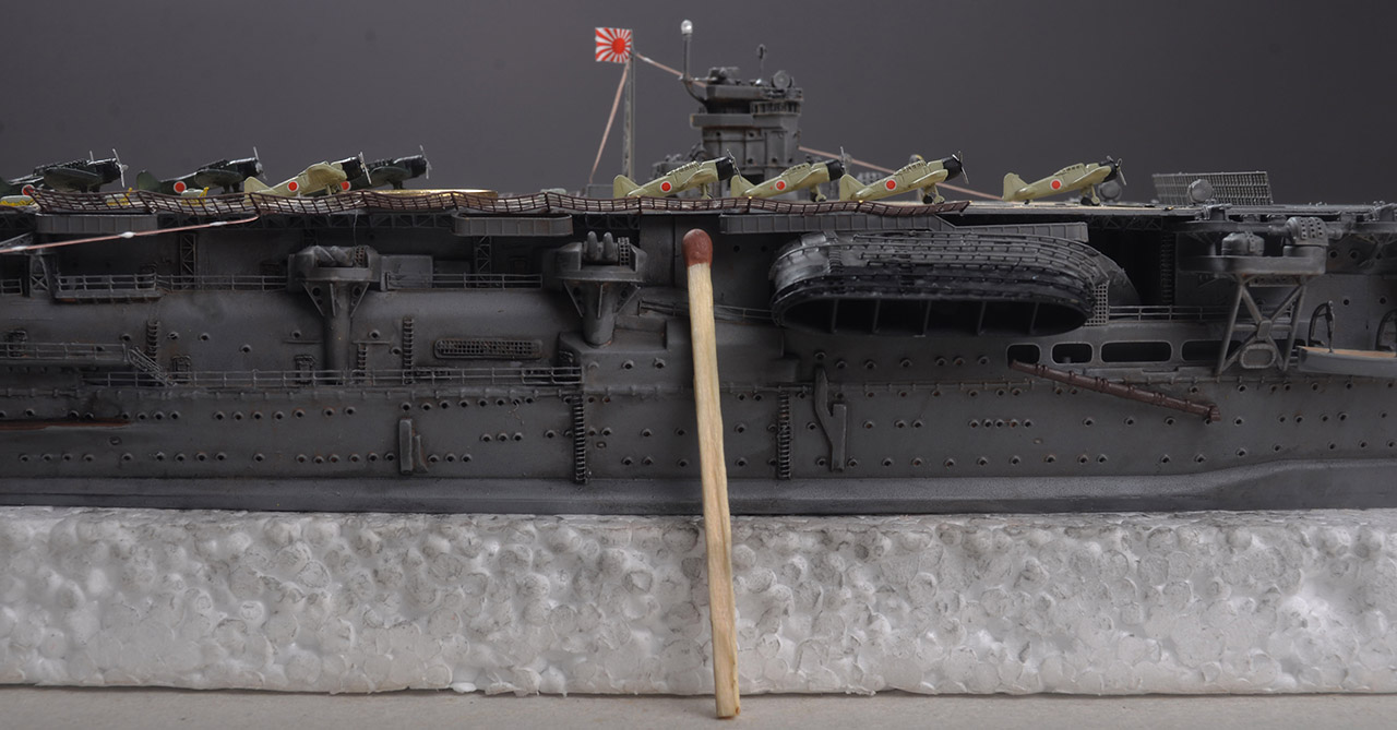 To jeszcze nie koniec relacji, gdyż siedemsetka bez morza jest jak ryba bez wody, więc będzie diorama. Akagi również nie może obyć się bez obstawy, osłania go pancernik - oczywiście Yamato, który jest zrobiony. Do kompletu dojdzie jeszcze niszczyciel Yukikaze klasy Kagero. Niszczyciel będzie na wspólnej dioramie z Akagi.