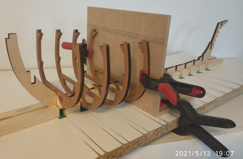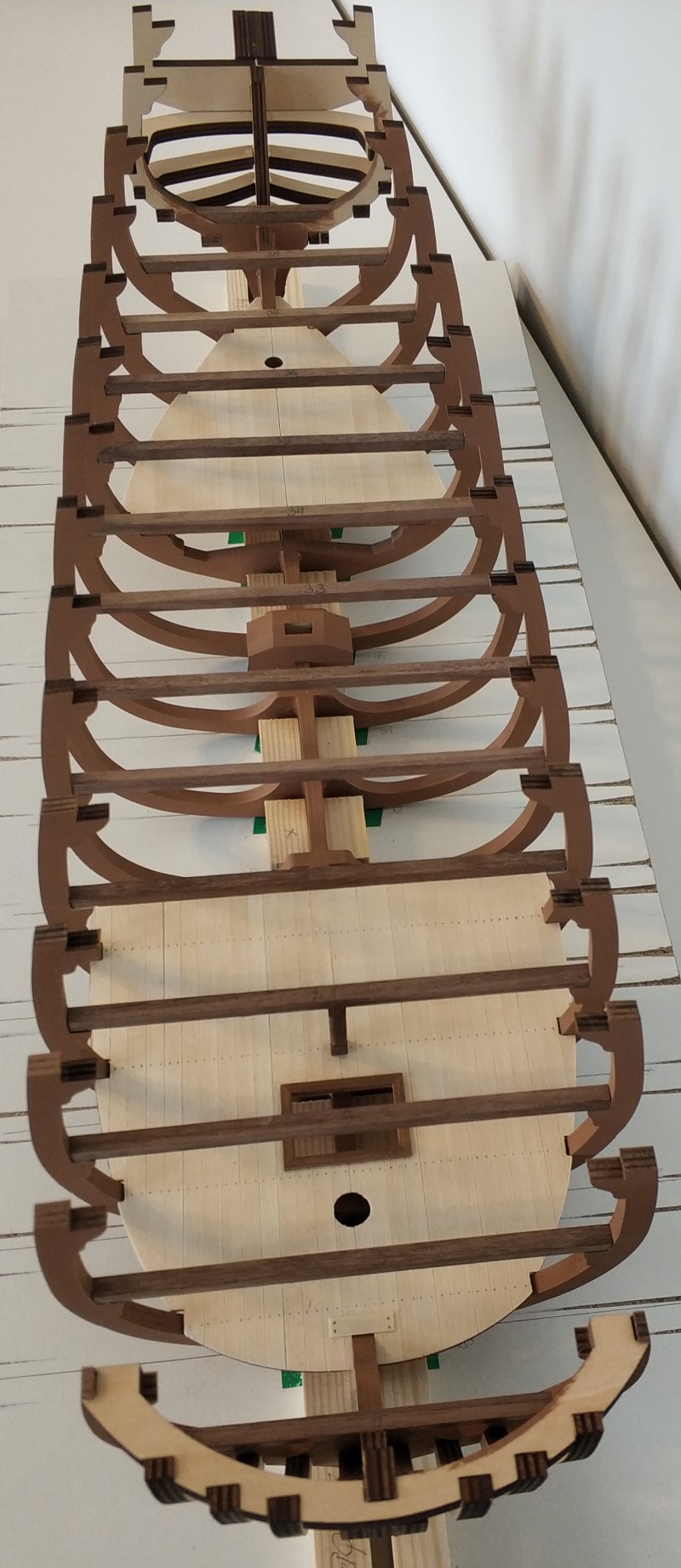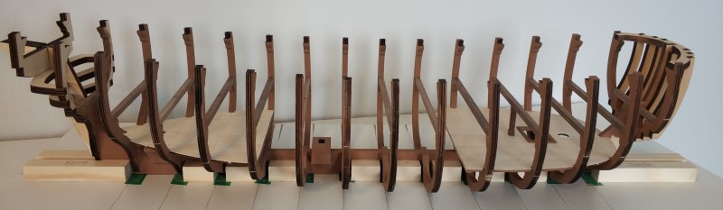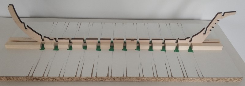 Kil, na skutek zapakowania elementów o różnej długości przy użyciu folii termokurczliwej, okazał się nieco zwichrowany. Wręgi dosyć luźno "latały" we wcięciach na kilu. Konieczne stało się więc zbudowanie prostej stoczni, żeby naprawić niedoróbki producenta.
