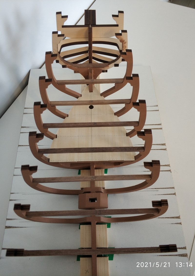 Rozstaw wręg w modelu wynosi 35-40 mm, co odpowiadałoby wymiarom rzeczywistym (x48) 168-192 cm. Taki rozstaw wręg byłby zdecydowanie za duży. W modelu admiralicji DeAgostini https://www.koga.net.pl/grupy/viewdiscu ... groupid=73 można się doliczyć 25 wręg (nie licząc wręg dziobowych i rufowych.