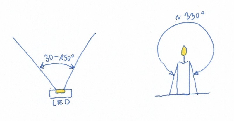 Zakładam, że oświetlenie modelu będzie włączane okazjonalnie i zasilanie bateryjne będzie wystarczające. Oczywistym wyborem źródła światła są w takim wypadku diody LED. Dobór właściwej diody imitującej światło lampy świecowej lub olejowej nie jest sprawą banalną. Dioda LED emituje światło w postaci stożka, który poprzez zainstalowanie w obudowie soczewki wklęsłej lub wypukłej, można odpowiednio zwęzić lub rozszerzyć. Ale w dalszym ciągu będzie to stożek, czyli patrząc na diodę z boku widzimy tylko światło rozproszone przez obudowę. Tymczasem płomień świecy świeci dookólnie (z wyjątkiem niewielkiej powierzchni dookoła podstawy). Dobrą imitacją świecy byłaby miniaturowa żarówka, ale przy 10 żarówkach, bateria szybko by się wyczerpywała. Mamy więc taką sytuację: