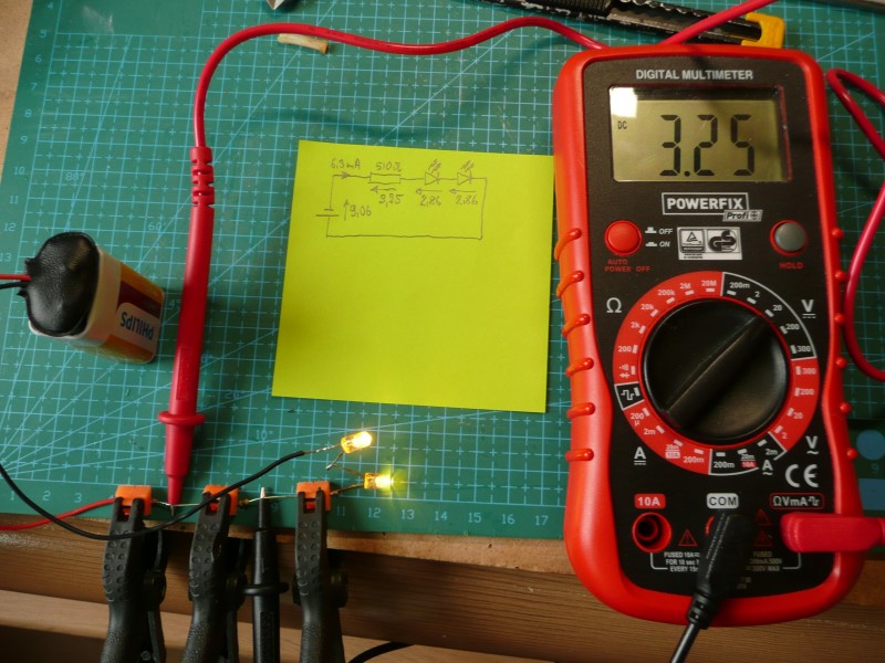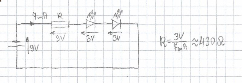 Najbardziej poręczne jest użycie baterii 9V, do której można dokupić zatrzask z przewodami. Optymalnym rozwiązaniem będzie więc użycie w obwodzie dwóch szeregowo połączonych diod LED.