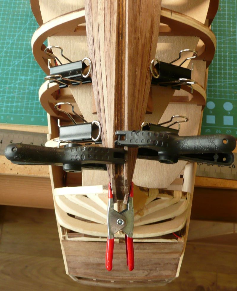 Kil, na skutek zapakowania elementów o różnej długości przy użyciu folii termokurczliwej, okazał się nieco zwichrowany. Wręgi dosyć luźno "latały" we wcięciach na kilu. Konieczne stało się więc zbudowanie prostej stoczni, żeby naprawić niedoróbki producenta.