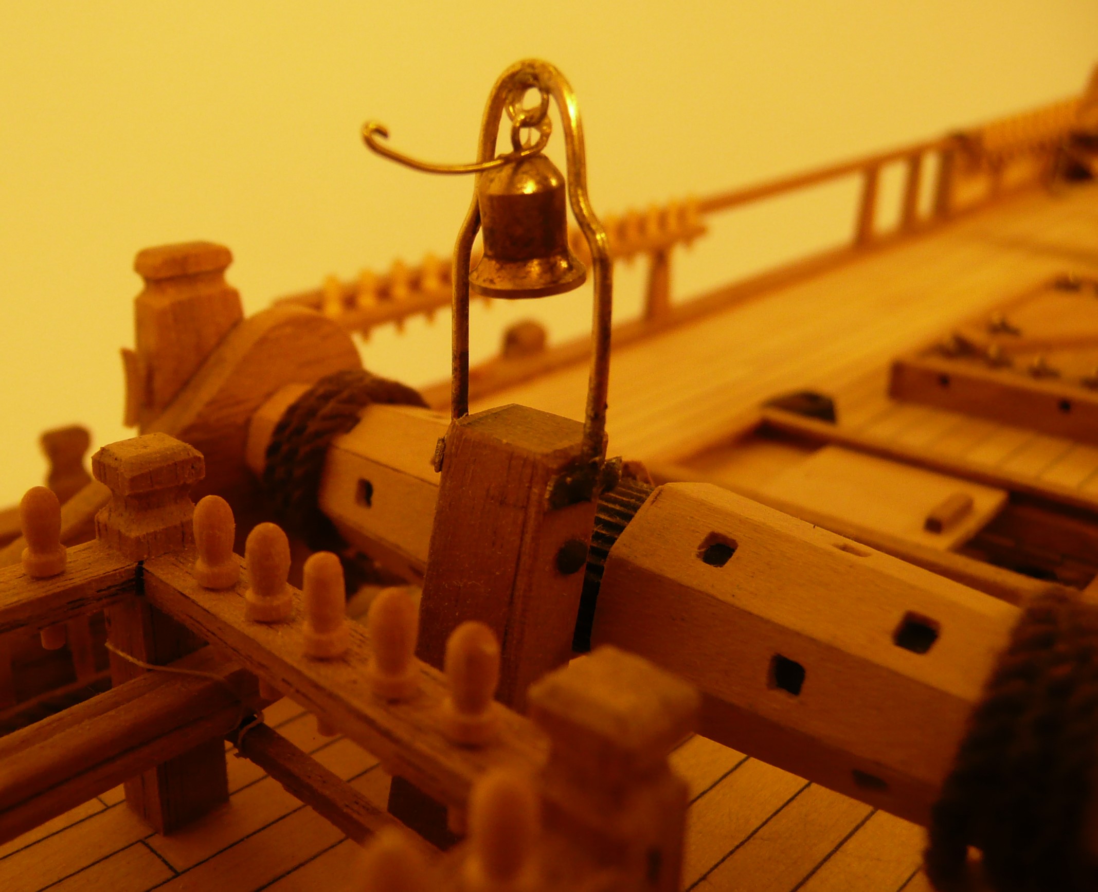 W trakcie przebudowy statku handlowego Bethia na HMS Bounty usunięto pierwotną dzwonnicę, a dzwon zawieszono na metalowej obręczy zamocowanej na słupku z zapadką kołowrota kotwicznego [J.McKay, Bounty, z serii Anatomy of the ship]