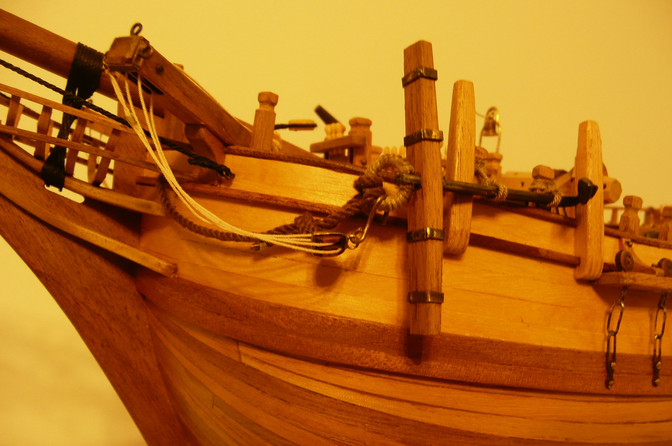 Na statkach floty Kolumba, które wcześniej budowałem, maszty miały prostą, najczęściej jednoczęściową konstrukcję. W kolejnych wiekach maszty stawały się coraz wyższe, wielopiętrowe, a ich konstrukcja uległa znacznej komplikacji. Na "Bounty" występują trzy maszty, a każdy ma trzy piętra (kolumnę, stengę i bramstengę). Technologię budowy masztów opisał na Kodze kolega Karrex https://www.koga.net.pl/grupy/viewdiscu ... groupid=70