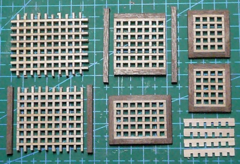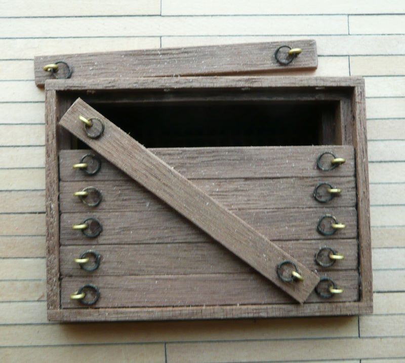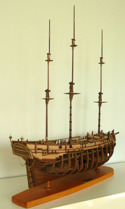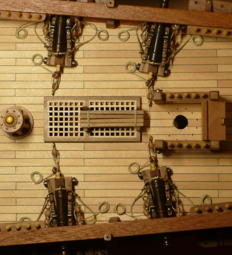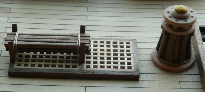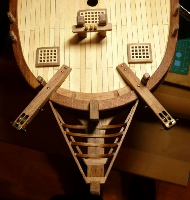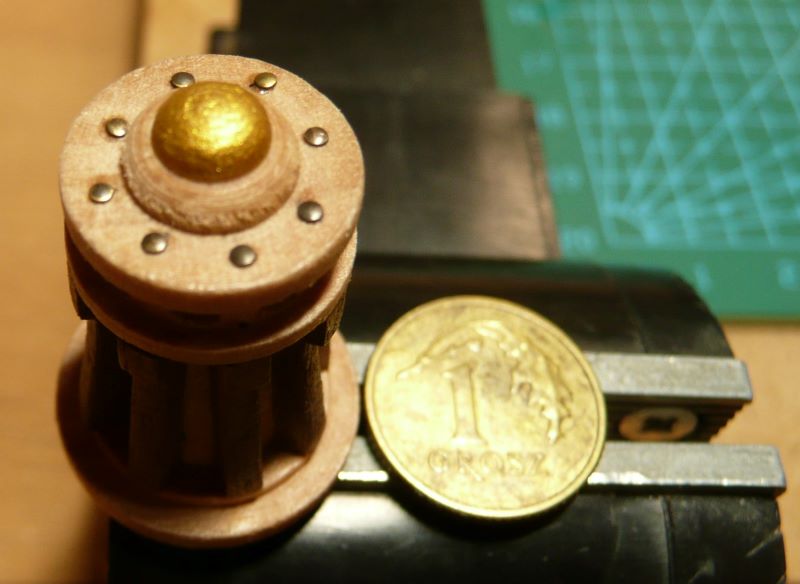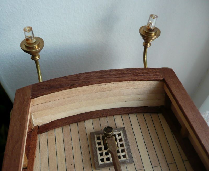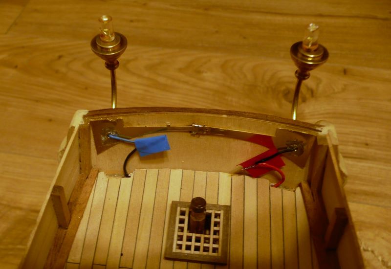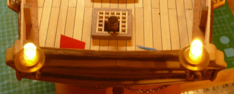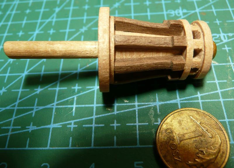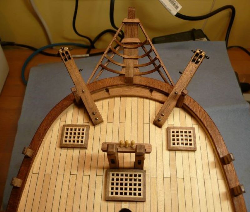 Podstawę lamp z zestawy przewierciłem i zamocowałem mosiężne rurki. W rurce o średnicy wewnętrznej 1 mm mieści się tylko jeden przewód w izolacji. Drugim przewodem musi być sama rurka. Obudowy lamp zostały więc połączone elektrycznie, a wszystkie połączenia wykonane przez lutowanie. Obudowy lamp są więc "pod napięciem", ale przy zasilaniu baterią 9V, porażeniem to nie grozi. Po zabudowaniu nadburcia na rufie: Kolejne elementy zabudowy pokładu to pokrywa luku ładunkowego i greting z handszpakami do kabestanu: Koło sterowe - elementy były w zestawie: Trochę zabawy było z przekładnią linową do poruszania rumplem. Zamiast nieciekawych bloczków z zestawu, użyłem bloczków o rozmiarze 4 mm firmy "Falkonet" Pozdrawiam
