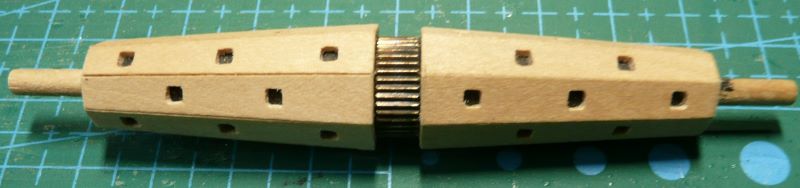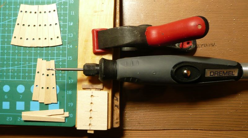 Długość listewek równa jest długości boku wałka i wynosi 35 mm. Przy użyciu wzornika nawiercone zostały otwory na handszpaki. Jednak z nieznanych mi powodów mają być kwadratowe - i tu dochodzimy do kwadratury koła.