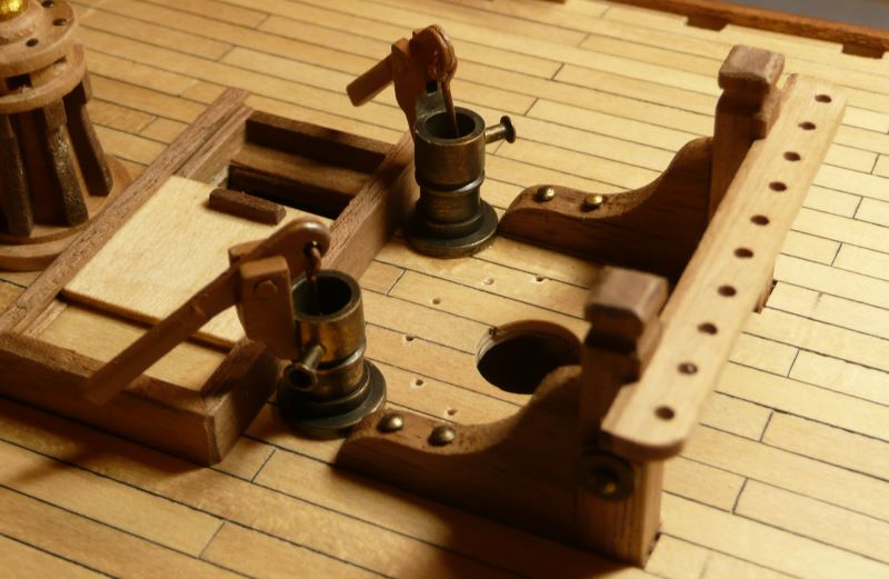 Określenie "kwadratura koła" funkcjonuje również w języku potocznym i oznacza coś niewykonalnego, z góry skazanego na niepowodzenie. Tak więc stoi przede mną zadanie niewykonalne - przynajmniej przy użyciu cyrkla i linijki. Użyję więc pilnika (niech mi matematycy wybaczą), tzw. iglaka o przekroju kwadratowym Jak widać kwadratura koła nie do końca się udała. Czarne tło rdzenia ma zapewnić "głębię" otworów. Handszpaki (ang. handspikes lub bars) były zakładane do kabestanu lub kołowrotu tylko w trakcie obsługiwania urządzenia przez załogę, a przez pozostały czas były przechowywane na stojakach - zwykle po obu stronach masztu. Tu założone do zdjęcia: Kabestan rufowy był już łatwiejszy do wykonania: Dodam jeszcze jeden obrazek https://en.wikipedia.org/wiki/Capstan_( ... apstan.jpg
