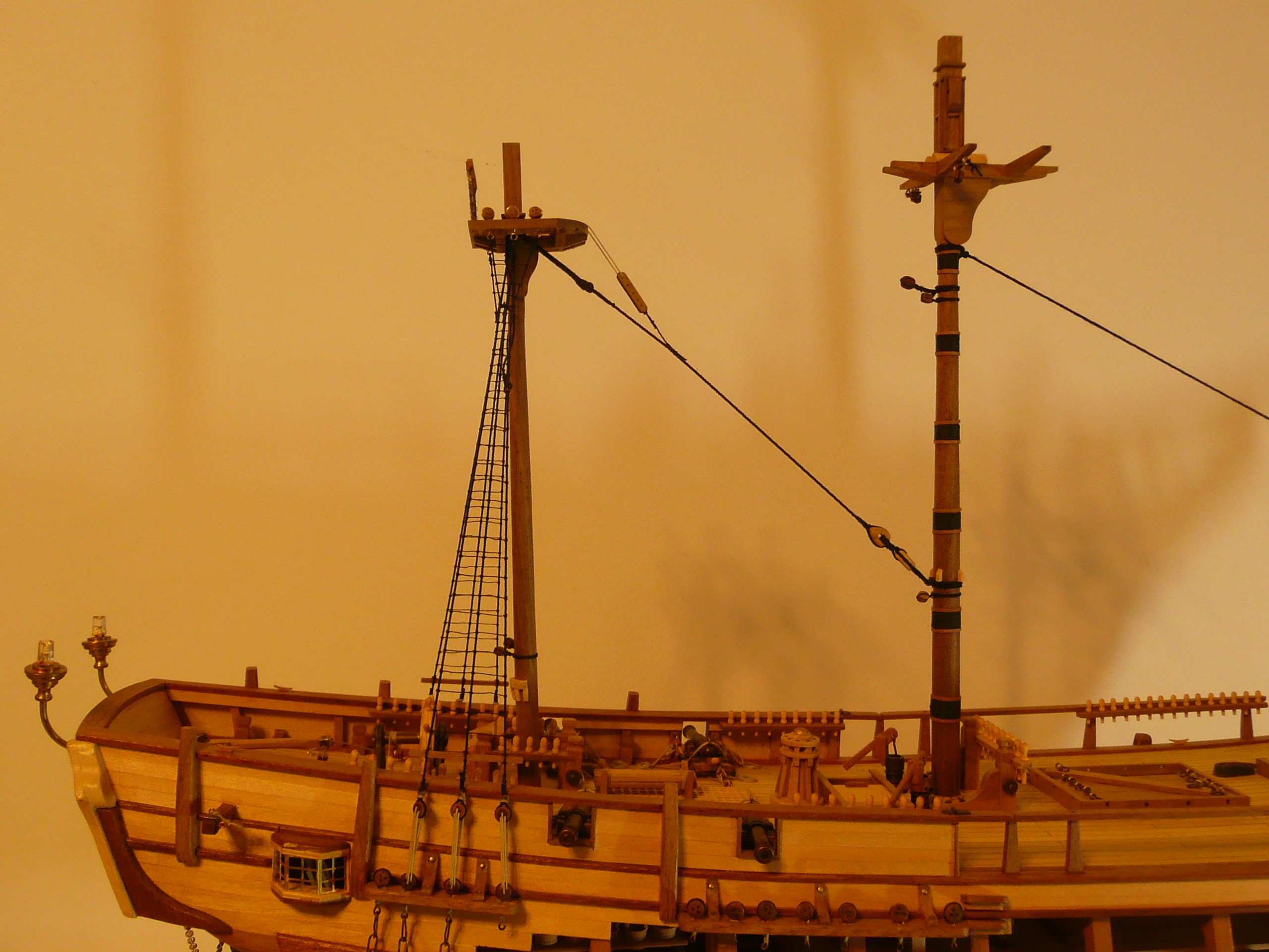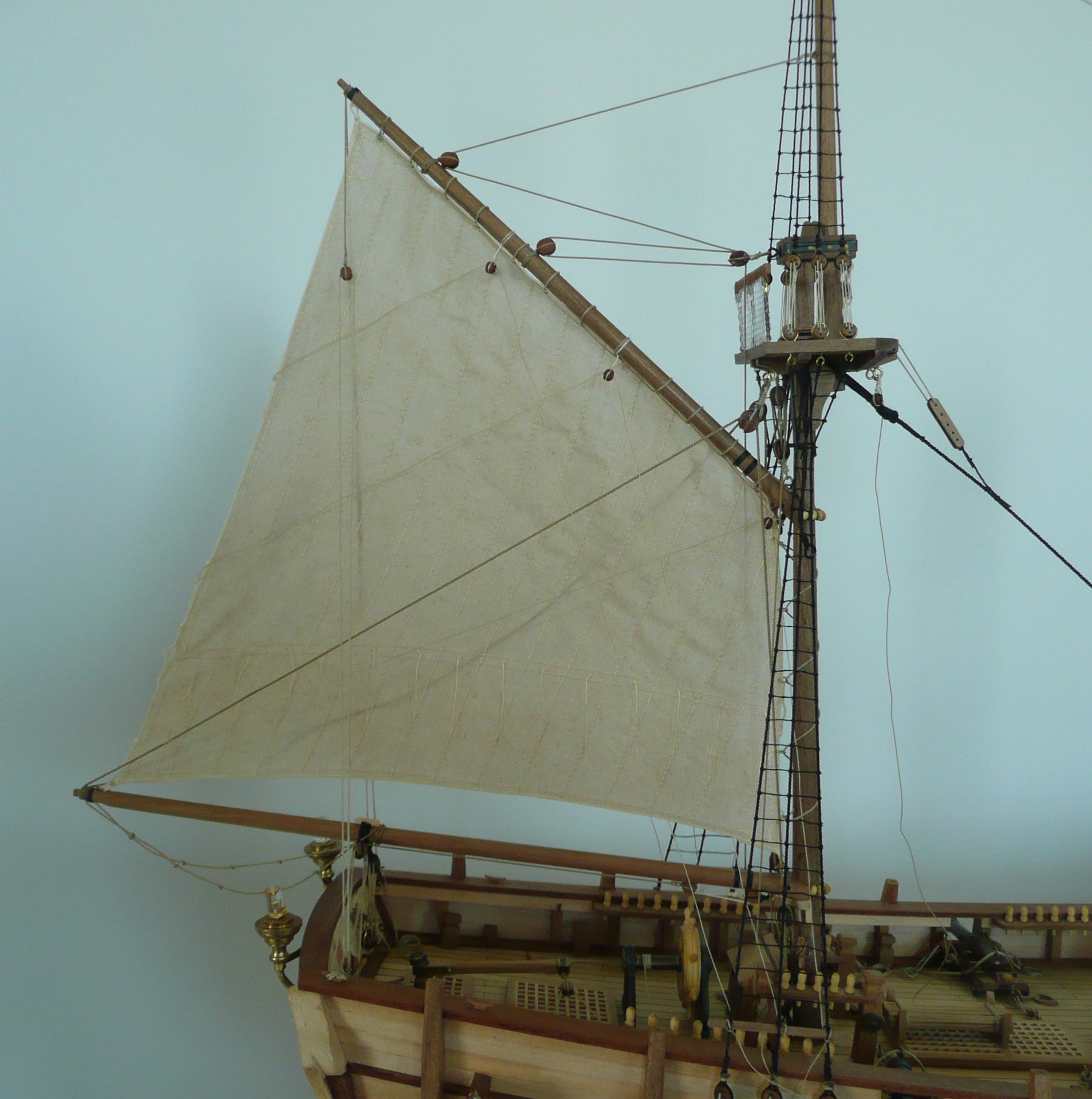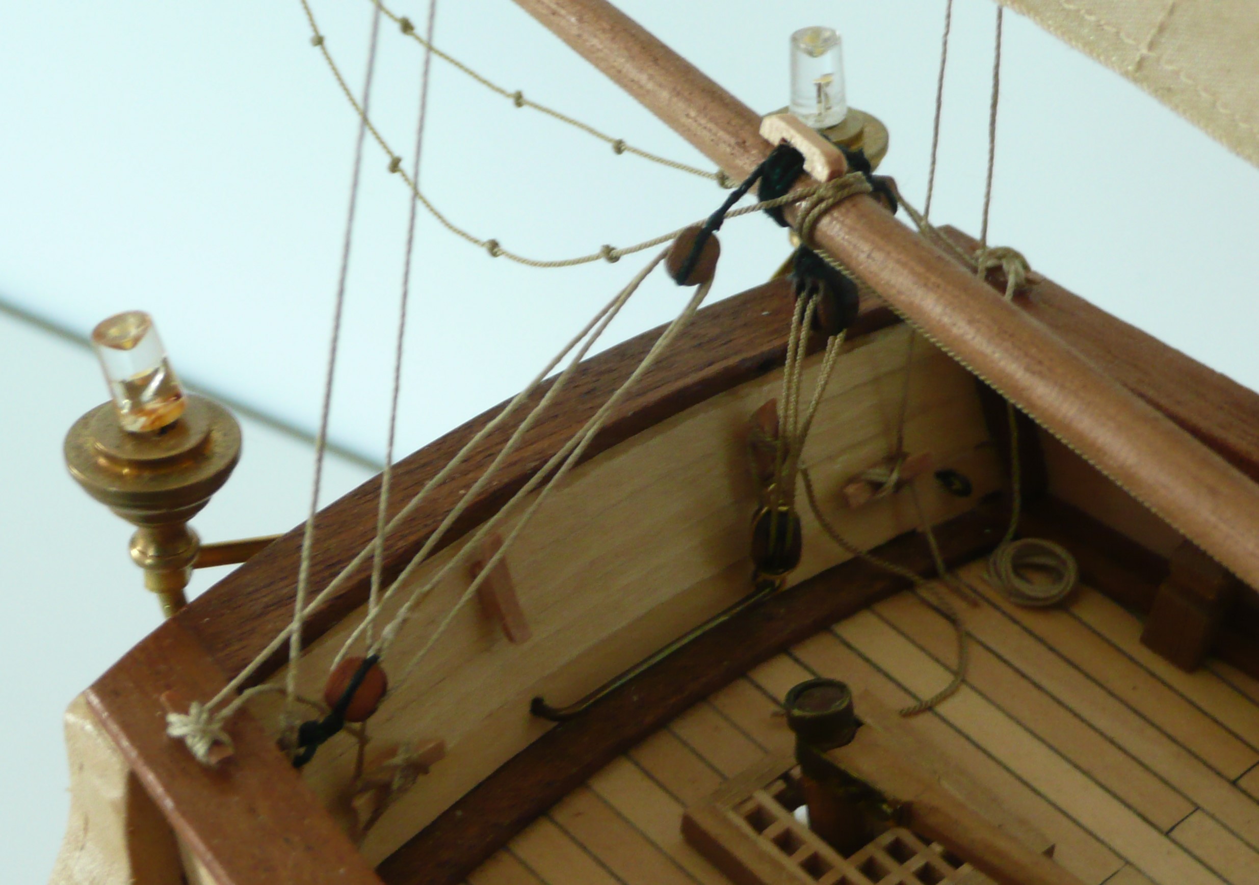 Patrząc na olinowanie, łatwo zauważyć, że większość lin jest prowadzona do pokładu lub burt i skierowana w stronę rufy (wanty, szoty, brasy itd). W końcu maszyną napędową żaglowca są żagle - tak ustawione, aby ciągnęły statek do przodu. Liny kompensujące parcie wiatru na żagle, będą więc skierowane przeciwnie - w kierunku rufy. Wydaje mi się, że dostępność punktów mocowania lin będzie ułatwiona, jeżeli pracę przy takielunku rozpocznie się od strony rufy. Po wklejeniu na stałe kolumn wszystkich masztów, olinowanie i ożaglowanie zacznę od bezanmasztu.