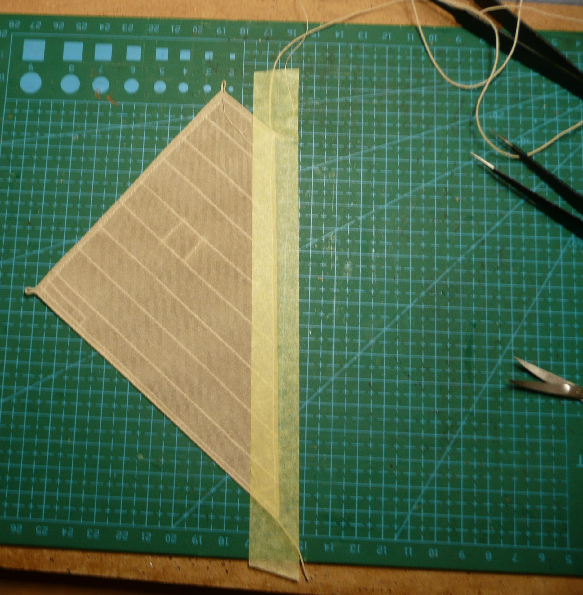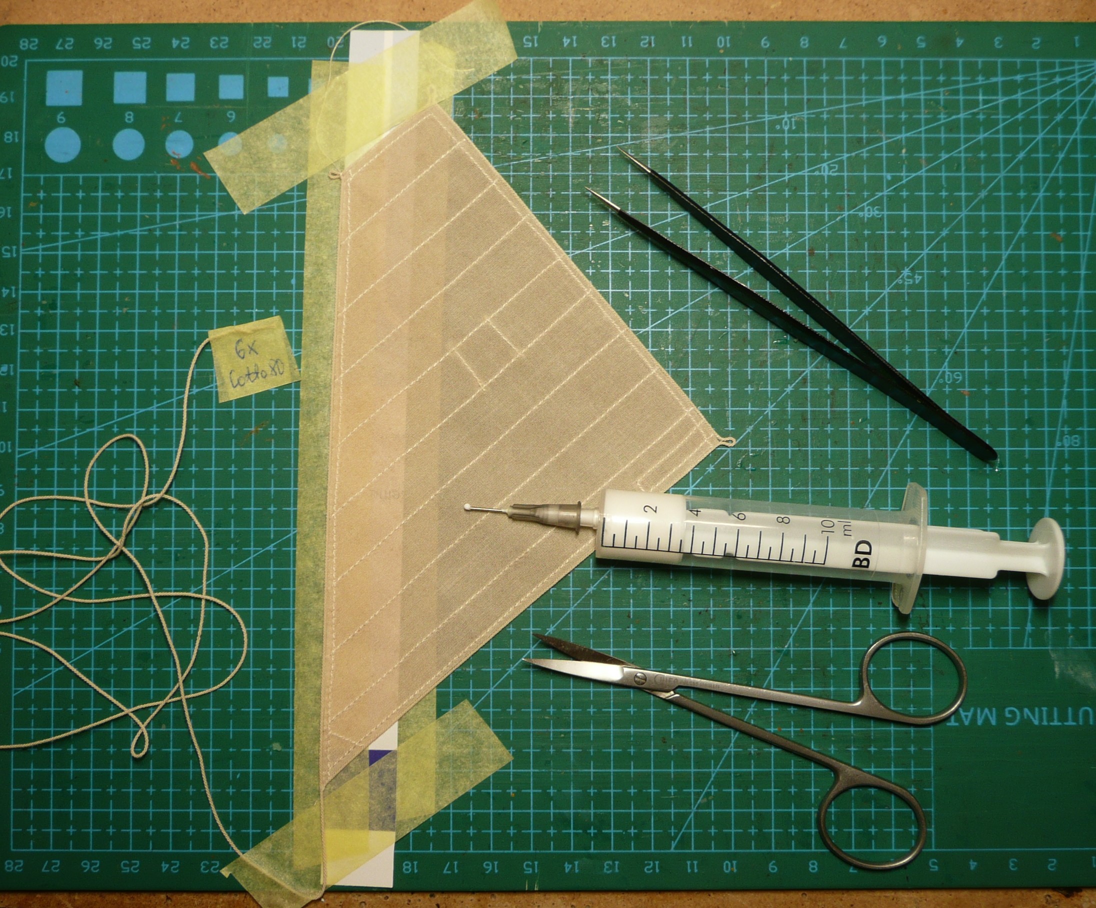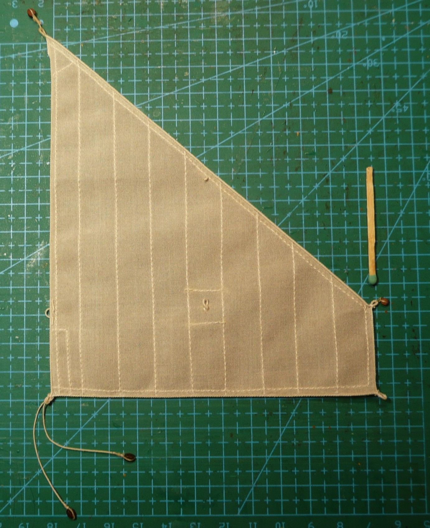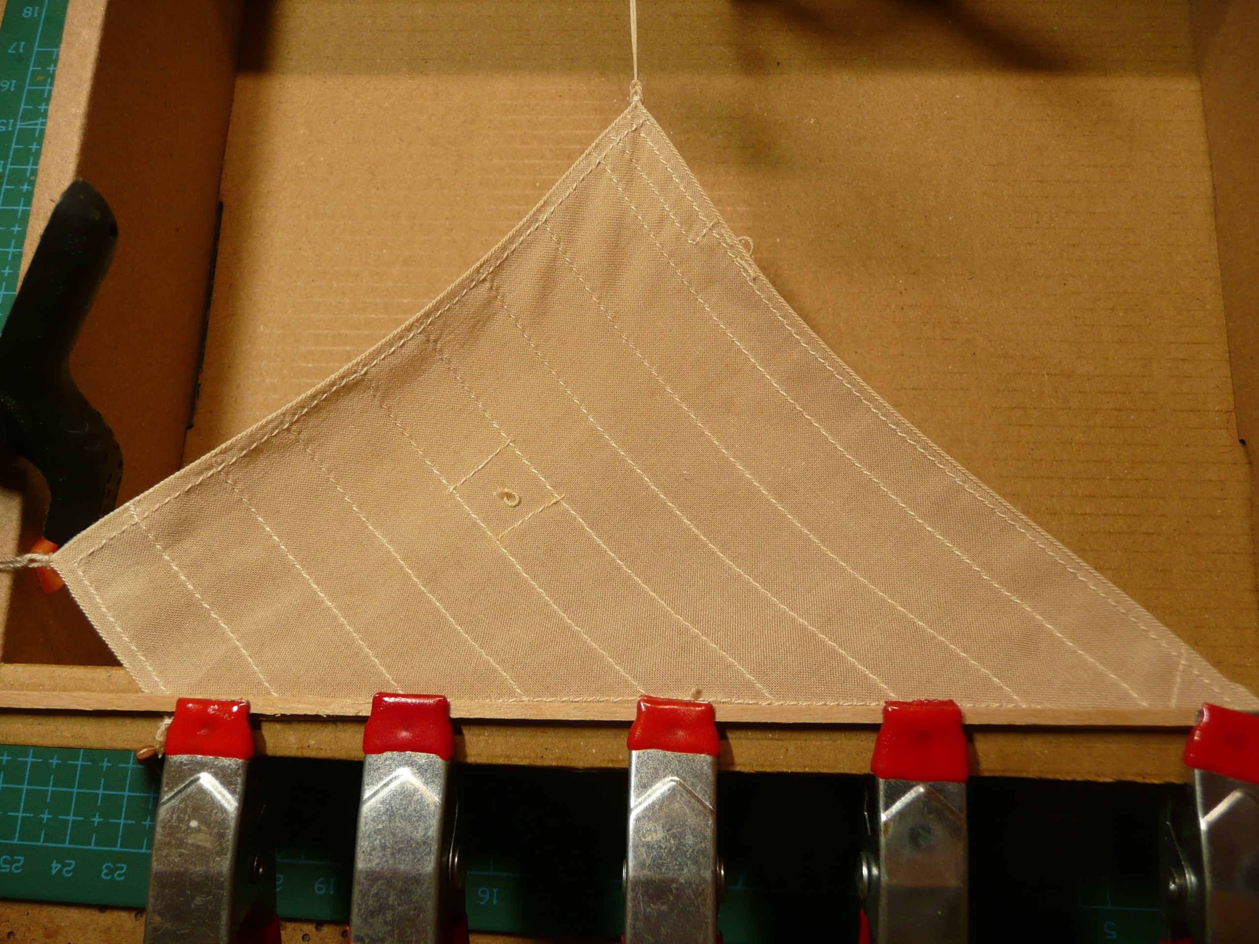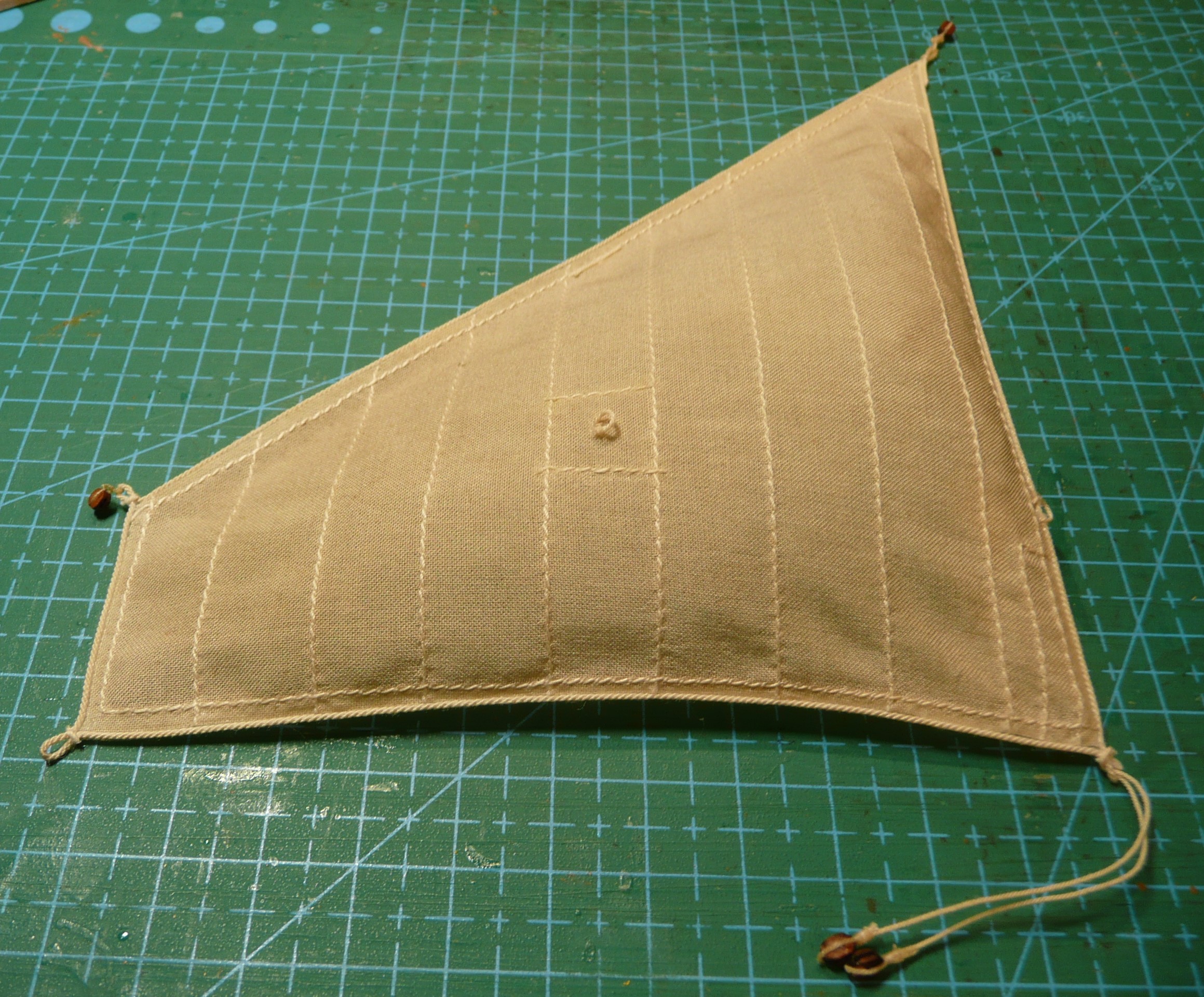 Płótno na żagle zostało namoczone w herbacie, a następnie nakrochmalone i przeprasowane. Na tak przygotowanym płótnie naniesiony został rysunek żagli przy użyciu pisaka ścieralnego. Wydawało mi się, że ścieranie tuszu odbywa się tak jak ścieranie śladu ołówka - ale tak nie jest. Tarcie gumką powoduje wydzielanie ciepła i to pod wpływem podwyższonej temperatury tusz przestaje być widoczny. Po włożeniu kartki do zamrażalnika tusz jest widoczny na nowo. (sprawdziłem! trwa to dosyć długo). Tak więc po przeszyciu brytów, tkaninę wystarczy przeprasować i rysunek znika. Muszę tylko pamiętać, że nie mogę z modelem wychodzić na mróz.