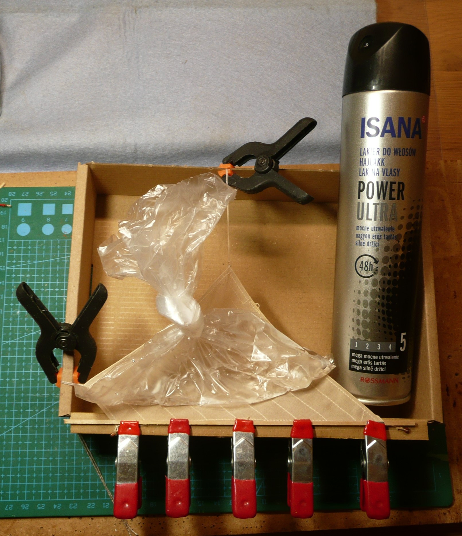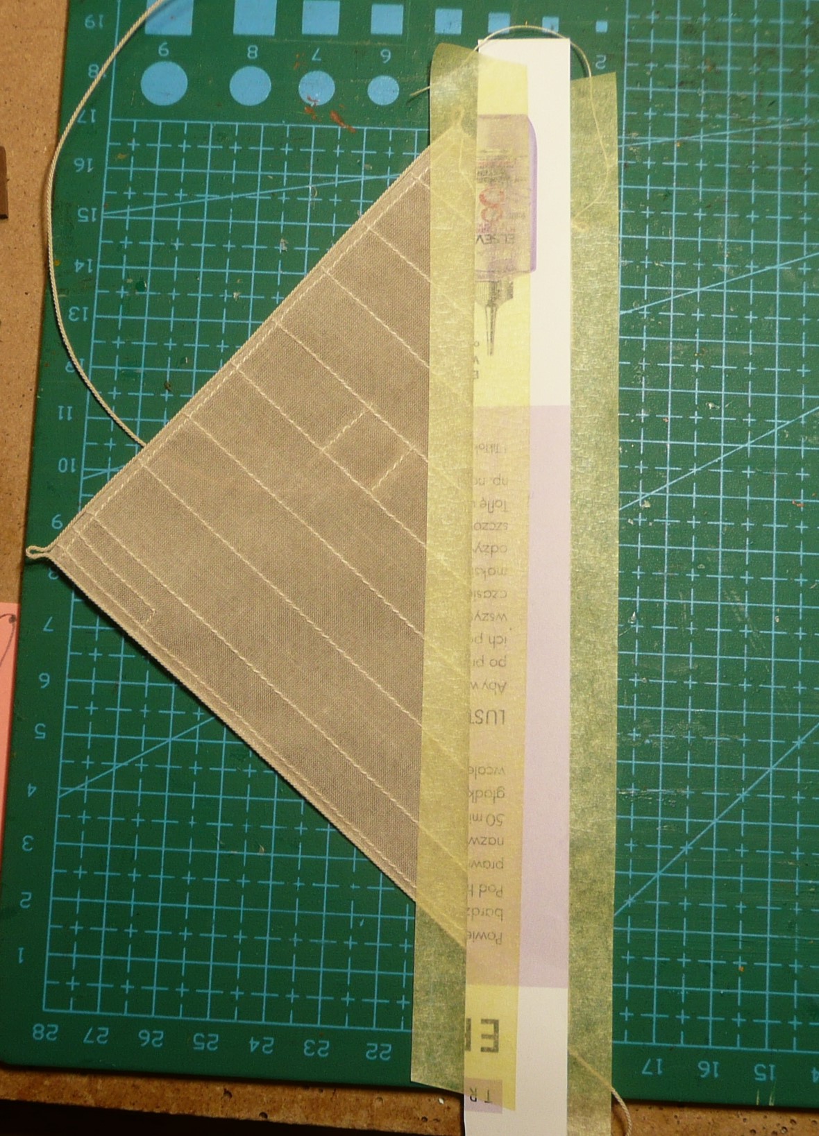 Kolejnym etapem jest przyklejenie likliny. Według Mondfelda (Historic Ship Models, str.258) dolne sztaksle powinny mieć liklinę o grubości 2/5 grotsztagu, co dla Bounty daje 0,7 mm. Otrzymałem ją przez skręcenie 6 nitek Ariadny Cotto 80. Na brzeg żagla naklejam taśmę malarską: Dodatkowo naklejam pasek papieru, którego zadaniem jest podniesienie tkaniny o 0,2 mm, tak aby klejenie następowało na środku likliny Następnie całość odwracam na drugą stronę i unieruchamiam taśmą samoprzylepną Liklinę naklejam na taśmę dociskając do brzegu tkaniny (jest podniesiona o 0,2 mm). Klej typu wikol (Rakoll) nanoszę na brzeg żagla przy użyciu strzykawki z obciętą igłą. żeby igła mi nie zaschła, trzymam ją w wodzie Po przewiązaniu uszek i dowiązaniu bloczków, żagiel jest gotowy do "napompowania" Pierwszym etapem do uzyskania efektu wybrzuszenia jest rozciągnięcie tkaniny na środku żagla. Nakrochmalona tkanina po rozciągnięciu, nie kurczy się. Kolejnym etapem jast zamocowanie żagla w kartoniku w taki sposób jak będzie mocowany na statku. Do utrwalenia kształtu stosuję lakier do włosów (dziękuję Lucynie), a obciążeniem jest woreczek foliowy z wodą. Woda rozpływa się na boki dając równomierne obciążenie. Pozdrawiam