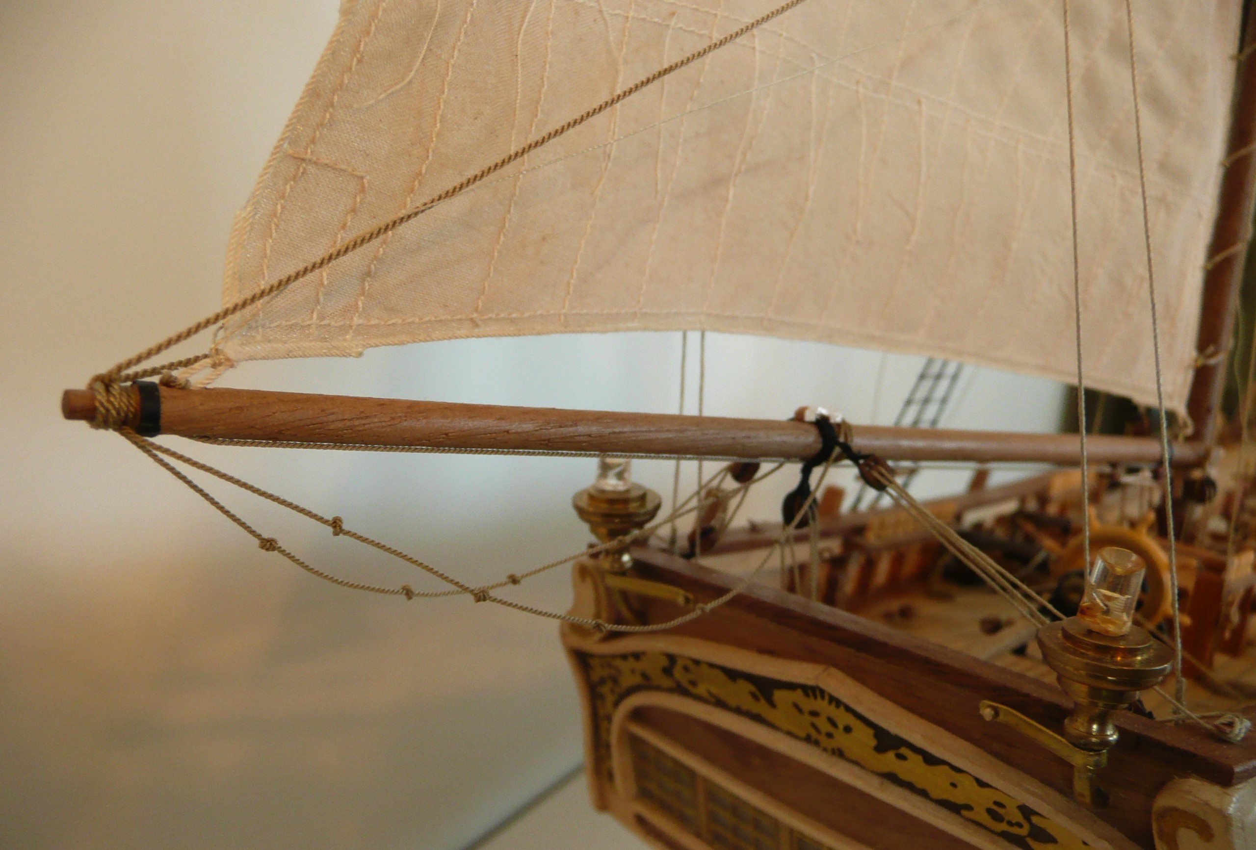 Co do takielunku dla zagli (jesli taka opcje wybrales do swego modelu), to dla modelu najlepiej i najlatwiej (latwiejszy dostep) zrobic jak najwiecej poza modelem, gdzies na stole. Tj. wymodelowany kompletnie zagiel z zamocowanymi don linkami (standing ends), przymocowac do rei, ktora tez ma swe wszystkie detale juz wykonane, i dopiero na koncu zawiesic to wszystko na maszcie. W dalszej kolejnosci zamocowac dolne konce (running ends) linek do przynaleznych im miejsc na pokladzie czy burtach, czy to do knag czy nagli, itp. - wg. planu/rozrysowania, tzw. belaying plan.