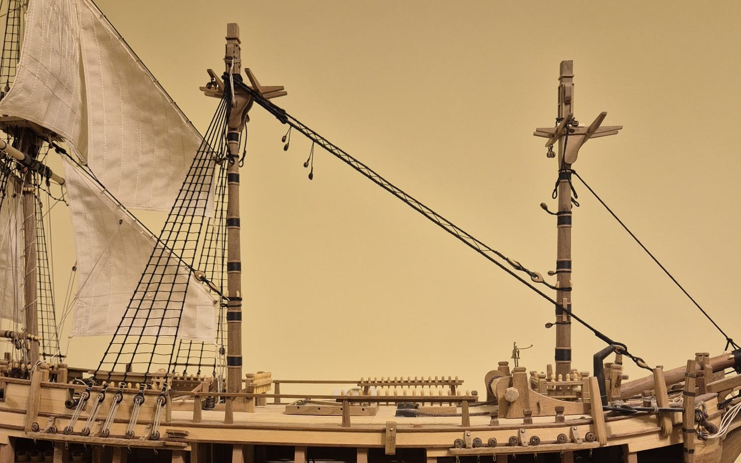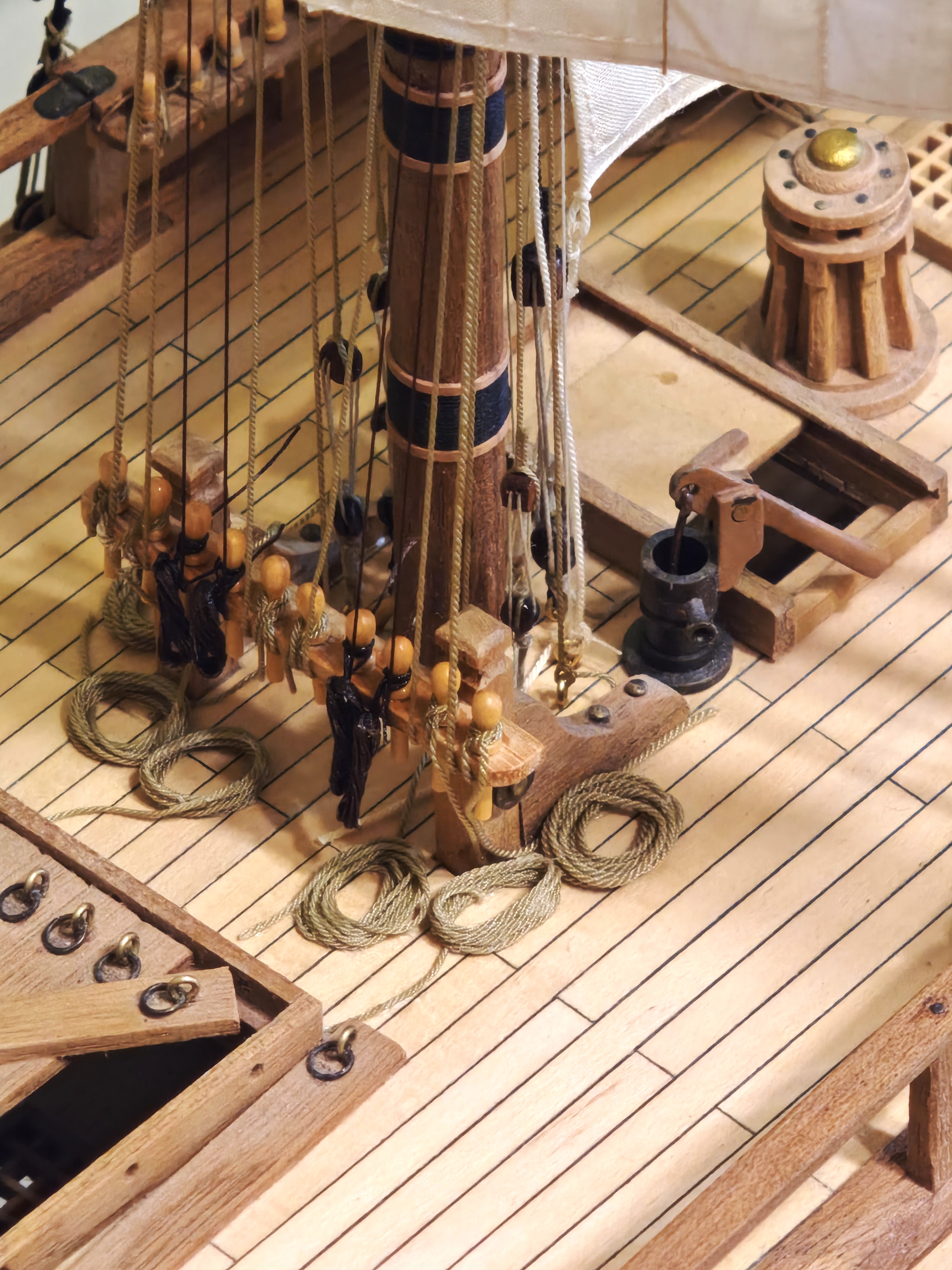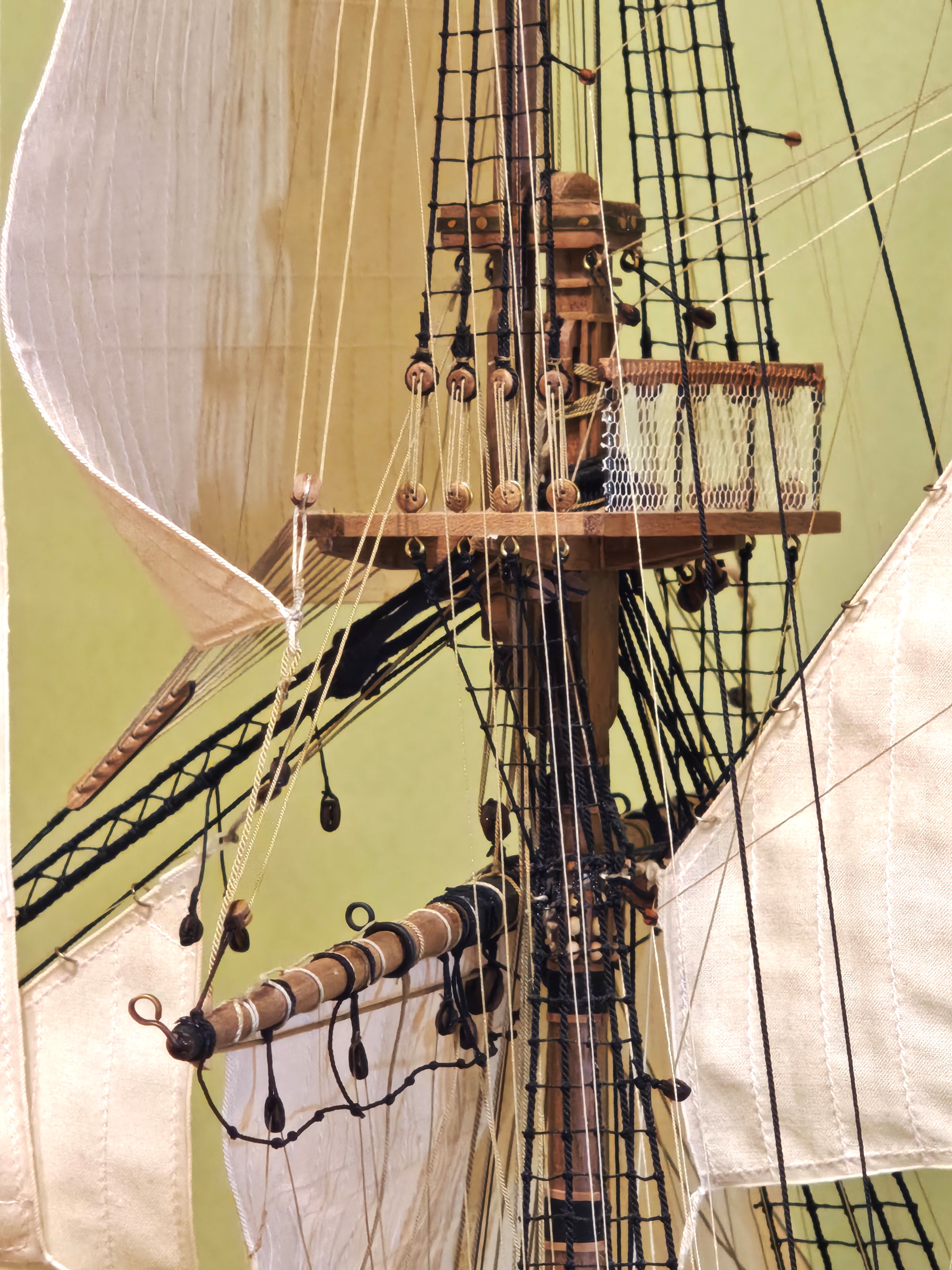Przyjęta koncepcja wykonania w pierwszej kolejności pełnego olinowania i ożaglowania bezanmasztu, sprawdziła się. Zostały mi do wykonania brasy górnych reji i buliny mocowane do olinowania grotmasztu.