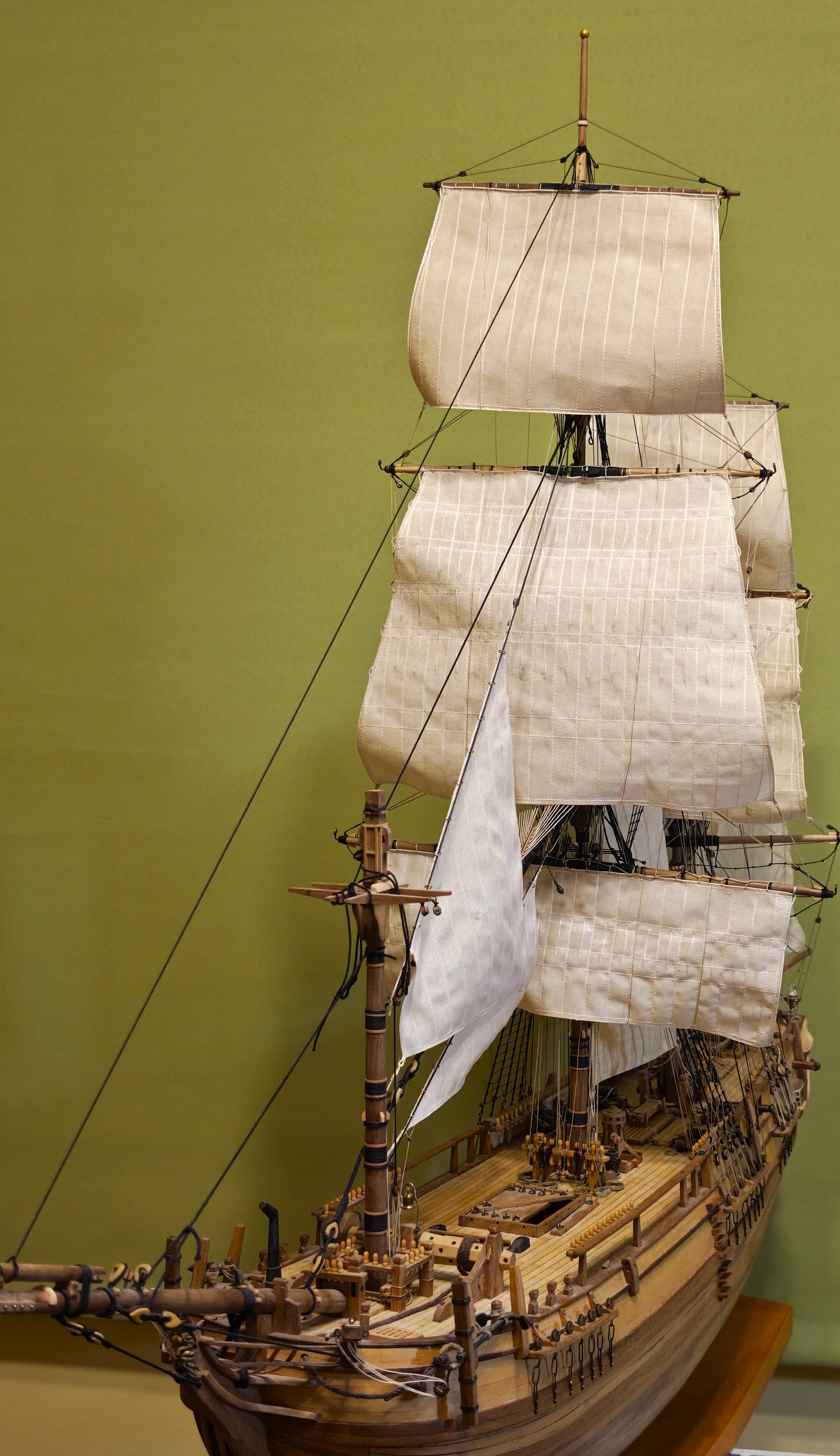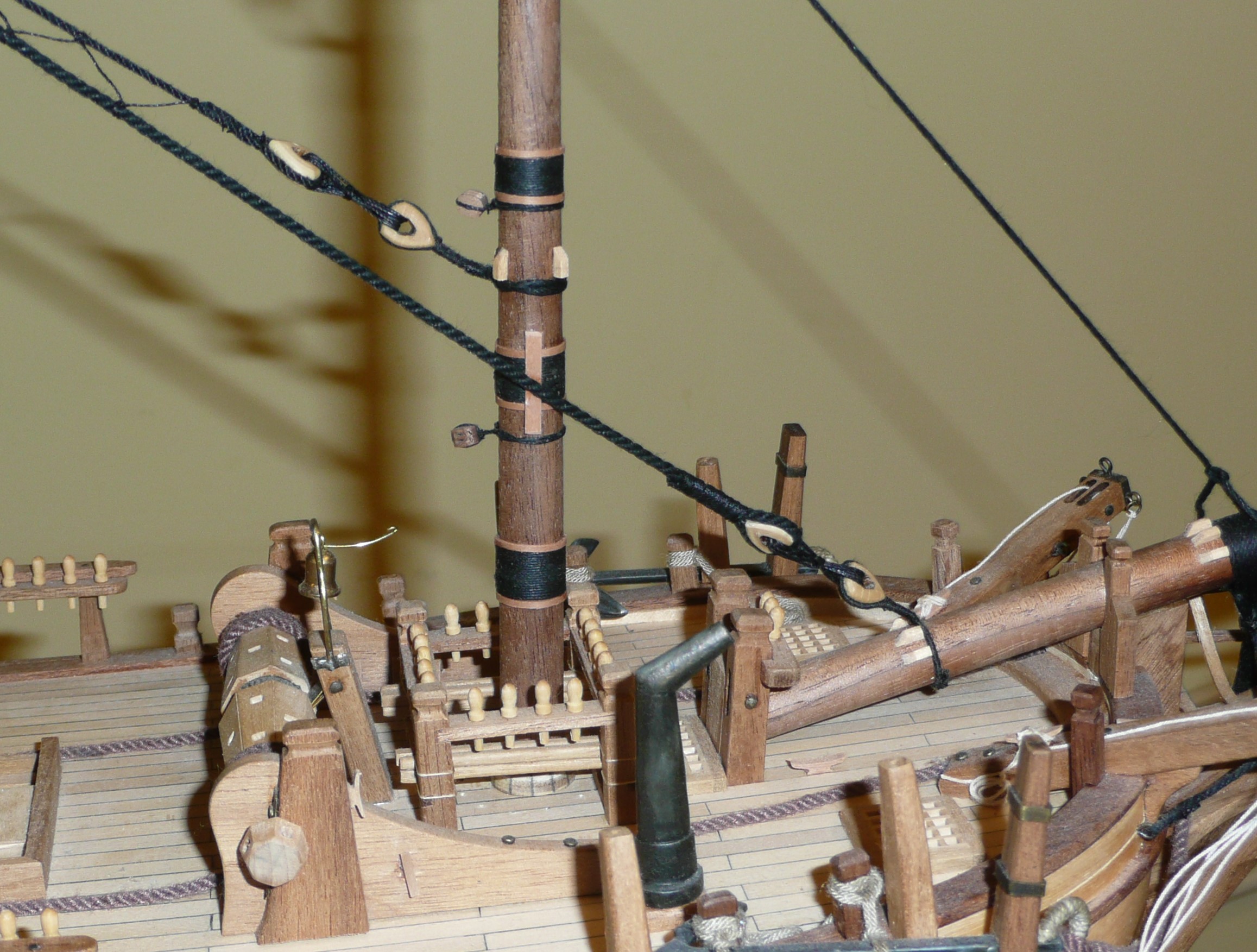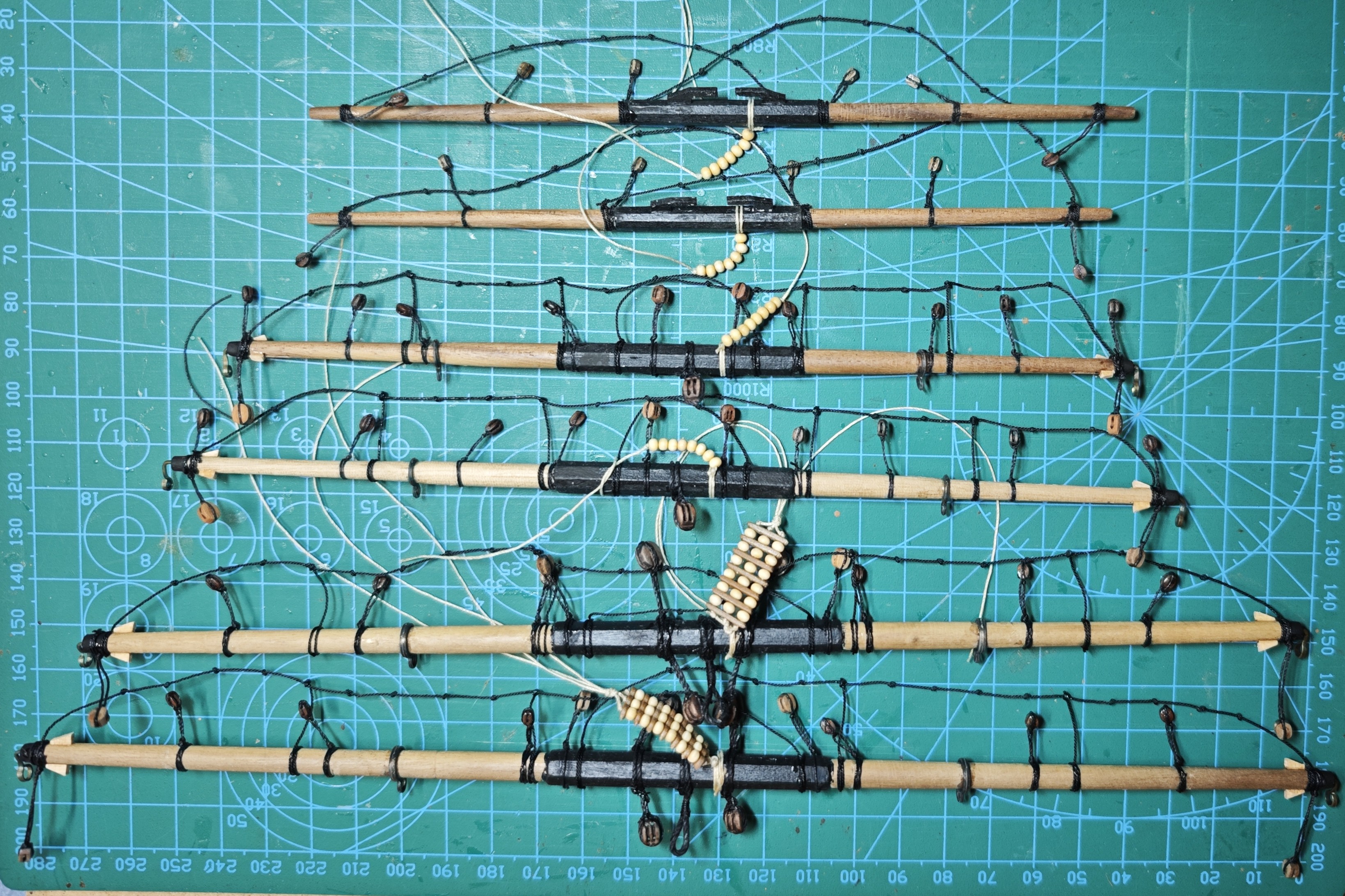 Przyjęta koncepcja wykonania w pierwszej kolejności pełnego olinowania i ożaglowania bezanmasztu, sprawdziła się. Zostały mi do wykonania brasy górnych reji i buliny mocowane do olinowania grotmasztu.