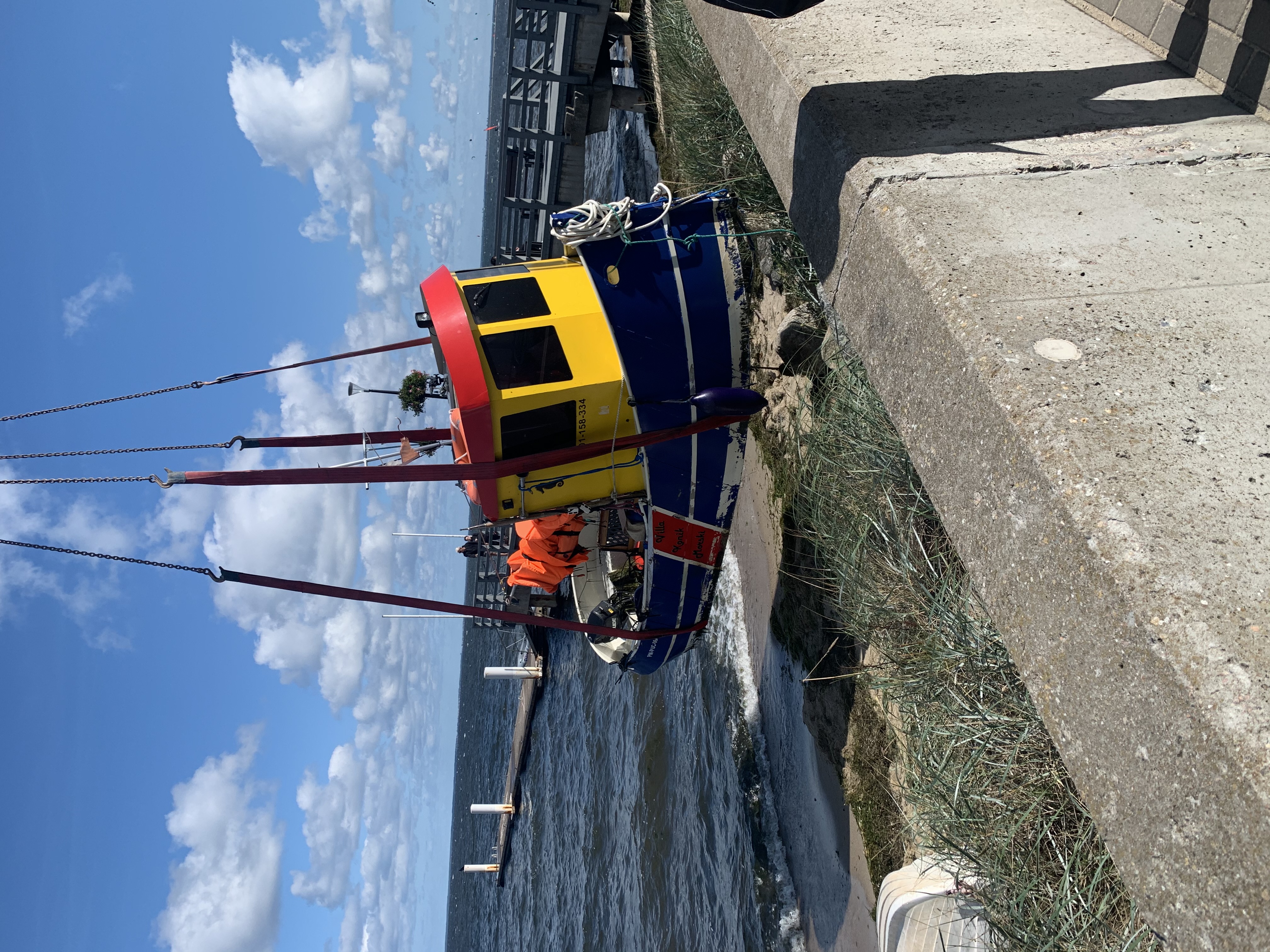 Myślałem że mnie skotłuje jak robiłem zwrot a miałem gacie pełne strachu . Podchodzę do jachtu , rzucam cumę, podczepia facet i zaczynam powolutku młócić silnikiem . Powoli dziób dużego jachtu odchyla się w stronę morza . Niestety w wodzie jest pełno pływających porwanych cum linek i cholera wie co jeszcze . Jedna z nich wkręca mi się w śrubę. Silnik się dławi krzyczę że odcinam hol ba zaraz sam wyląduję na kamieniach . Sternik jest w miarę bezpieczny tego jachtu . Może zeskoczyć na kamienie bo jego jacht wybił sobie olbrzymią dziurę i zatonął częściowo na brzegu. Ja odchodzę i próbuję dojść do pomostu i co jak już niemal rzucam cumę gaśnie mi silnik Biorę bosak i ten ześlizguje się z grzybka polera .Potem wiadomo siła wiatru znosi na brzeg W ostatniej chwili mój silnik zapala tylko po to by ustawić holownik dziobem do brzegu Na fali wchodzę na piasek i kamienie . Wzywam zięcia by natychmiast przyjechał moim F-350 ( to taka ciężarówka udająca pickapa) Biore cumę dziobową i wyciągam poza strefę fal ale i tak w kadłubie w ciul wody wlało się do środka Następnego dnia HDSem wyjmujemy jacht i mój holownik na miejsce postojowe do remontu. Ot taka mała przygoda