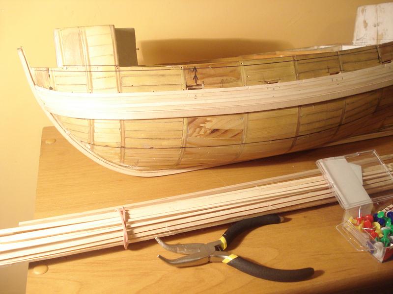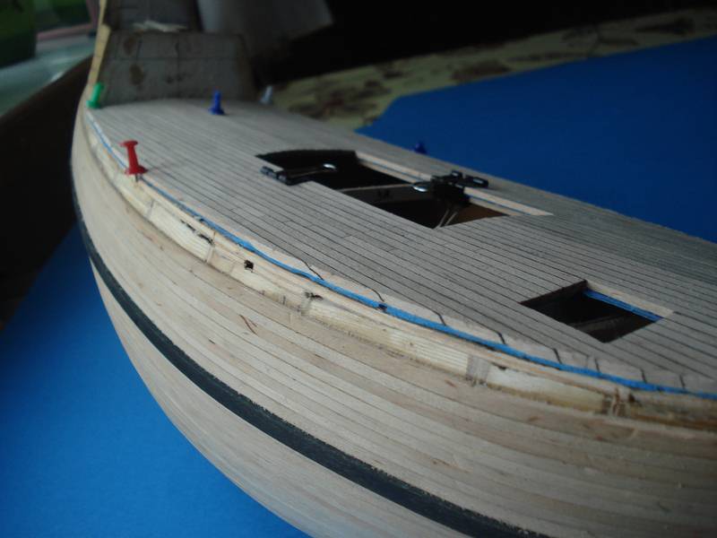 Witam. Powoli zaczynam brać się za wklejanie pokładów i przymiarek do poszycia. Zacząłem od listw odbojowych, po dwie z każdej burty. W sumie ten galeon ma 4 na każdej burcie lecz ja dałem na razie po dwie sztuki, listewki są tymczasowe, przyczepione(przybite na gwoździki). Zacząłem od tych listewek z tego względu żeby w miarę dokładnie rozmieścić otwory furt działowych, no a potem pomogą w układaniu poszycia.