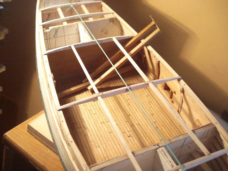 Zacząłem pokład, listewki 3mm a między nimi czarny papier ta metoda jest ok. Pokład będzie ze spadkiem tak jak powinno być w oryginale - skorzystałem z programu Adama w którym podaje się długość pokładu w danym miejscu a drukara drukuję gotowy łuk, dobra rzecz nie trzeba tańcować z cyrklem. Trochę miałem przebłysków z pasowaniem pokładu na śródokręciu, z jednej strony przybrakło mi 2mm- pokład nie zgrywał się z burtą musiałem zerwać 3 górne listwy poszycia i przeszlifować – i jest ok. Niestety pokłady nie wyszły tak jak chciałem zrobię je jeszcze raz. Muszę kupić jakiś lakier bezbarwny matowy żeby nie ściemniał mi tak ostro drewna jak pokost.