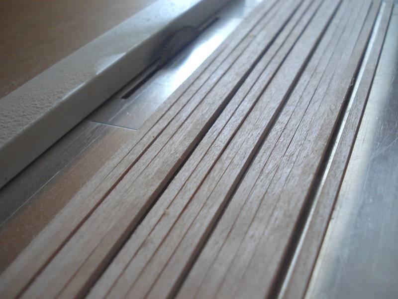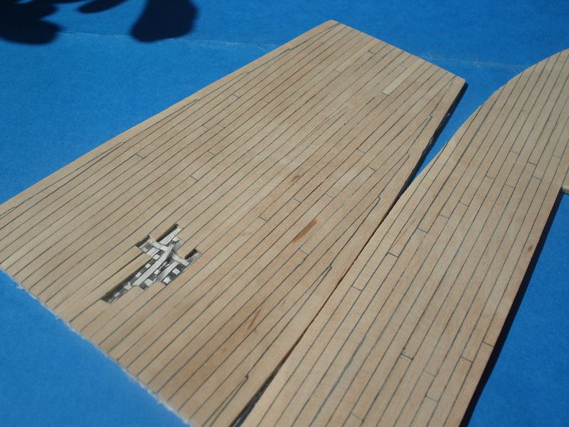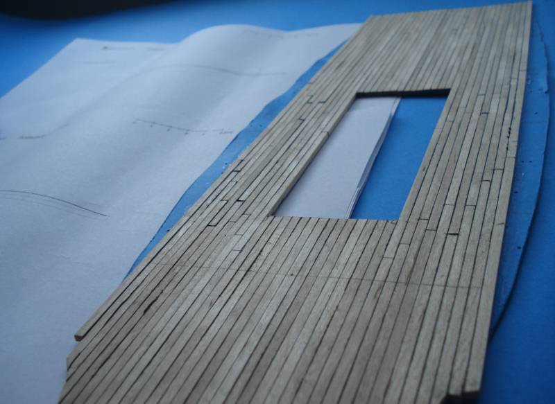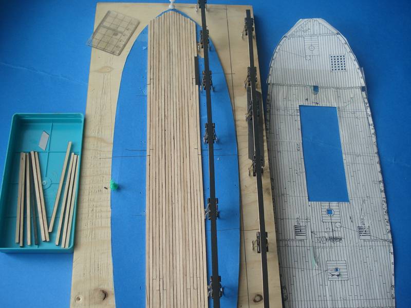 Zacząłem pokład, listewki 3mm a między nimi czarny papier ta metoda jest ok. Pokład będzie ze spadkiem tak jak powinno być w oryginale - skorzystałem z programu Adama w którym podaje się długość pokładu w danym miejscu a drukara drukuję gotowy łuk, dobra rzecz nie trzeba tańcować z cyrklem. Trochę miałem przebłysków z pasowaniem pokładu na śródokręciu, z jednej strony przybrakło mi 2mm- pokład nie zgrywał się z burtą musiałem zerwać 3 górne listwy poszycia i przeszlifować – i jest ok. Niestety pokłady nie wyszły tak jak chciałem zrobię je jeszcze raz. Muszę kupić jakiś lakier bezbarwny matowy żeby nie ściemniał mi tak ostro drewna jak pokost.
