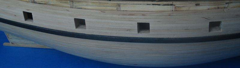 Witam. Powoli zaczynam brać się za wklejanie pokładów i przymiarek do poszycia. Zacząłem od listw odbojowych, po dwie z każdej burty. W sumie ten galeon ma 4 na każdej burcie lecz ja dałem na razie po dwie sztuki, listewki są tymczasowe, przyczepione(przybite na gwoździki). Zacząłem od tych listewek z tego względu żeby w miarę dokładnie rozmieścić otwory furt działowych, no a potem pomogą w układaniu poszycia.