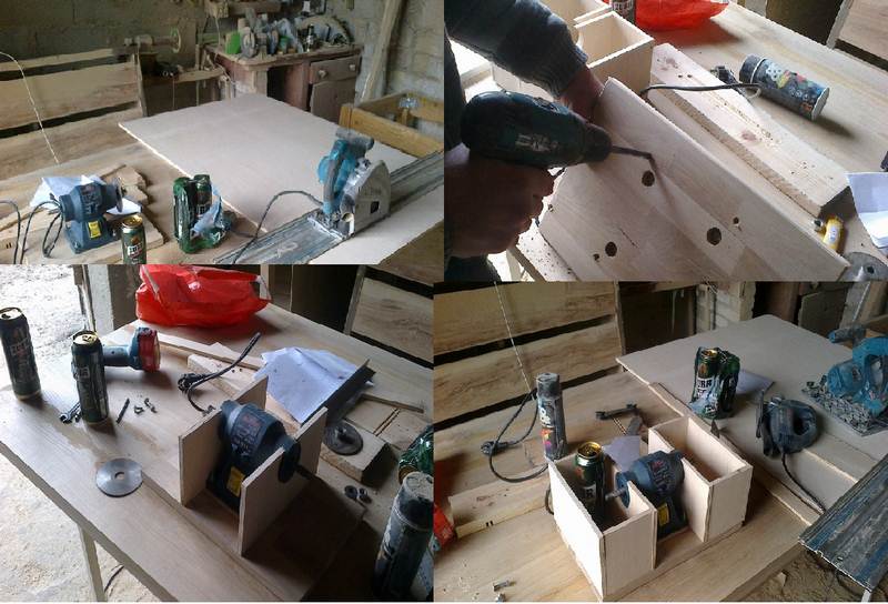 Po lewej będzie szlifierka tylko jeszcze będzie wycięty otwór na tarczę(kółko ze sklejki10mm) z papierem ściernym.