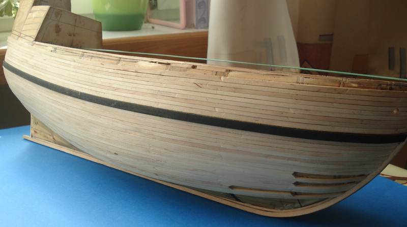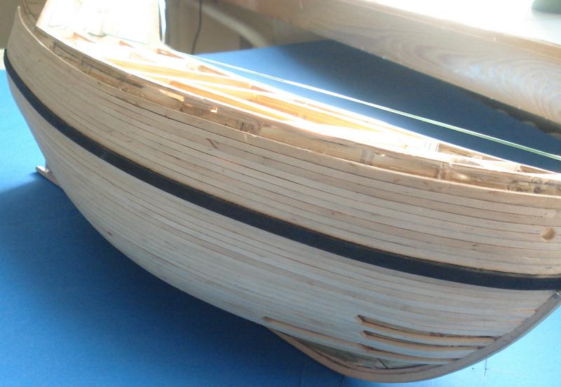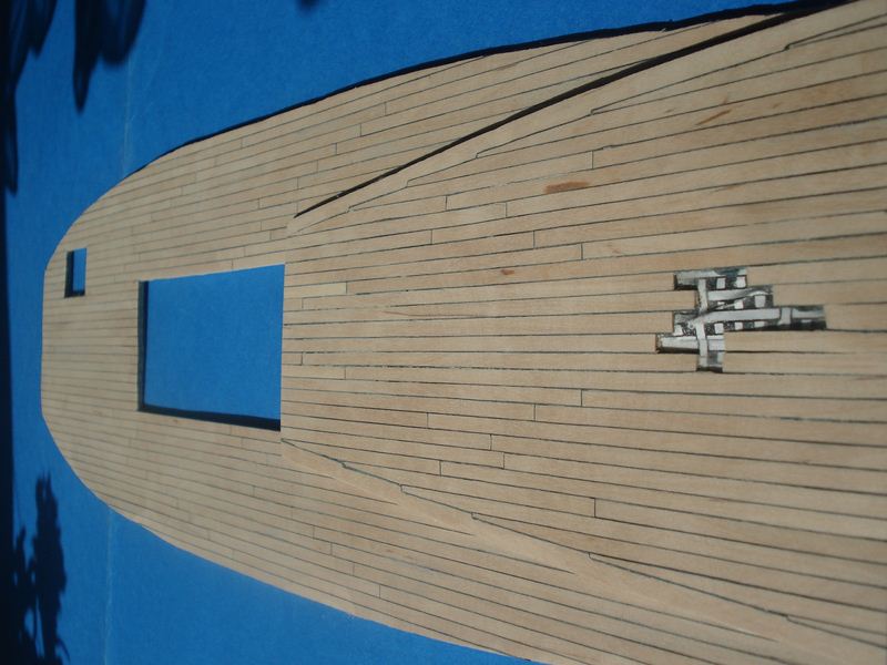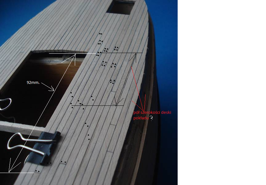 Zacząłem pokład, listewki 3mm a między nimi czarny papier ta metoda jest ok. Pokład będzie ze spadkiem tak jak powinno być w oryginale - skorzystałem z programu Adama w którym podaje się długość pokładu w danym miejscu a drukara drukuję gotowy łuk, dobra rzecz nie trzeba tańcować z cyrklem. Trochę miałem przebłysków z pasowaniem pokładu na śródokręciu, z jednej strony przybrakło mi 2mm- pokład nie zgrywał się z burtą musiałem zerwać 3 górne listwy poszycia i przeszlifować – i jest ok. Niestety pokłady nie wyszły tak jak chciałem zrobię je jeszcze raz. Muszę kupić jakiś lakier bezbarwny matowy żeby nie ściemniał mi tak ostro drewna jak pokost.