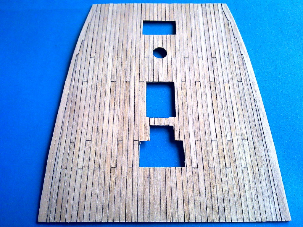 Prace posunęły się do przodu. Pokłady wykonane w 80 %, zostało jeszcze kołkowanie. Zastanawiam się, jaka metoda kołkowania będzie dobra w tej skali - czy wiercić otwory wiertłem 0,5 mm i wklejać kawałki forniru, czy igłą lekarską ( deska ma 2,5 mm).