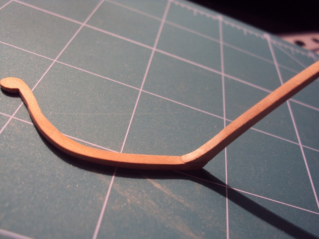 Rozpocząłem pracę z elementami kosza dziobowego. Tak wygląda pierwszy element. Jak widać powstał on z 2 części sklejonych razem. Wykonane z obłogu jabłoni grubości 3 mm :