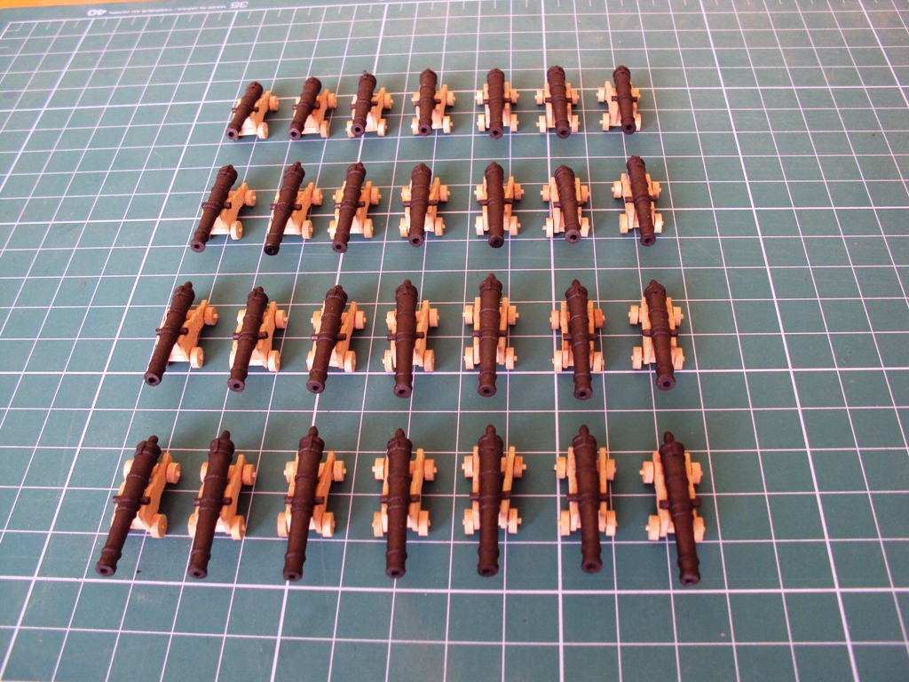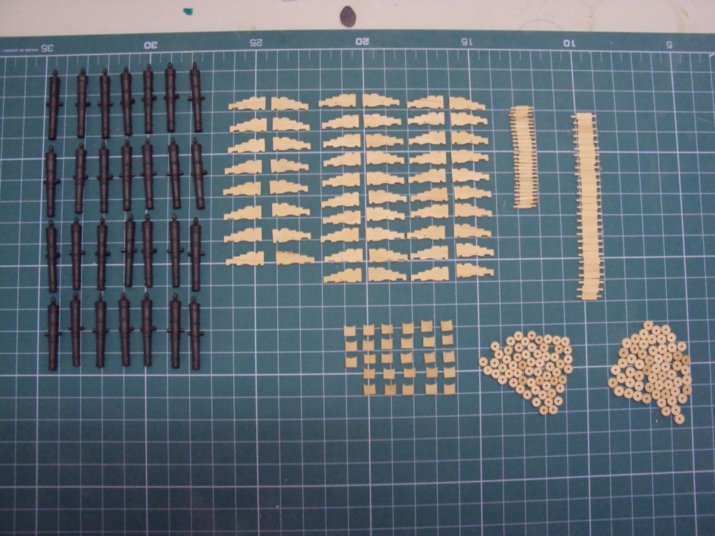 Zrobiłem lawety pod działa 18 funtowe. Przed składaniem postanowiłem wykonać hurtowo wszystkie elementy. Trochę tej drobnicy było: