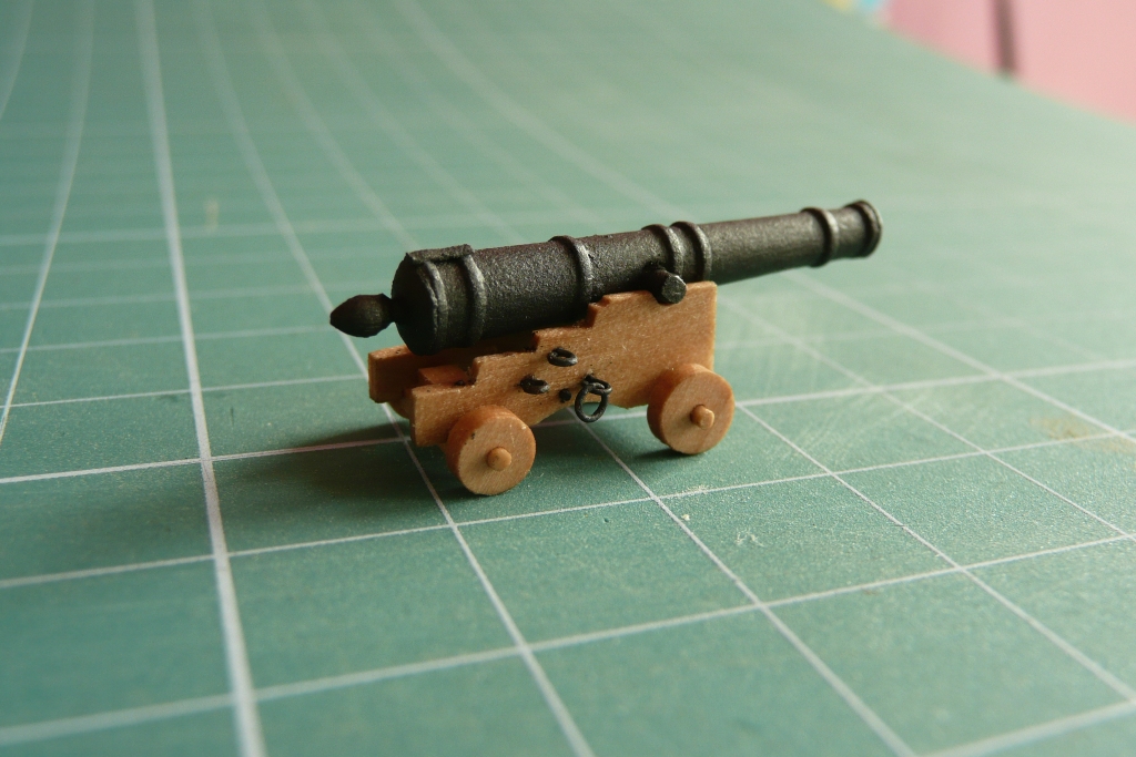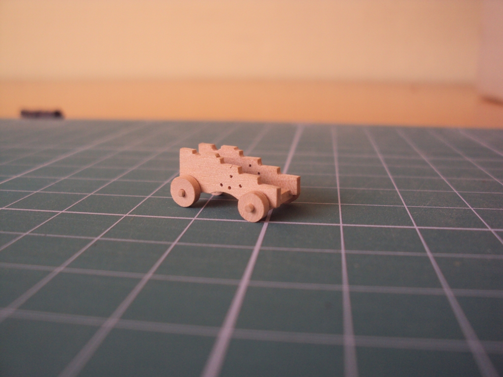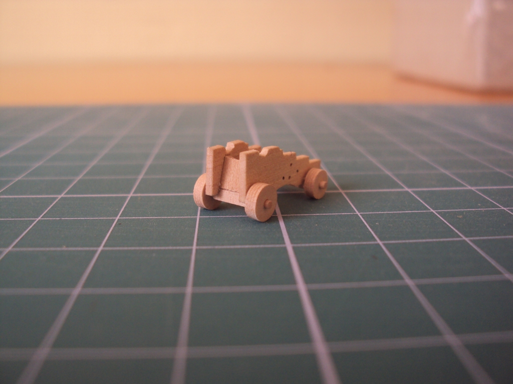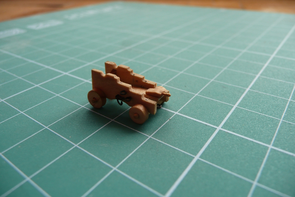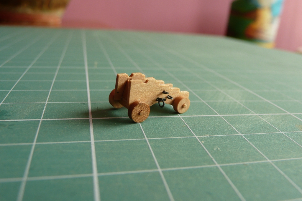 Dokończyłem lawety. Został do zrobienia zawias trzymający lufę, ale to przed samym taliowaniem. Dorobiłem półkę i kliny po lufę. Uchwyt na klinie toczyłem w podobny sposób jak ośki kół. Grusza to materiał super, da się toczyć bardzo małe elementy: