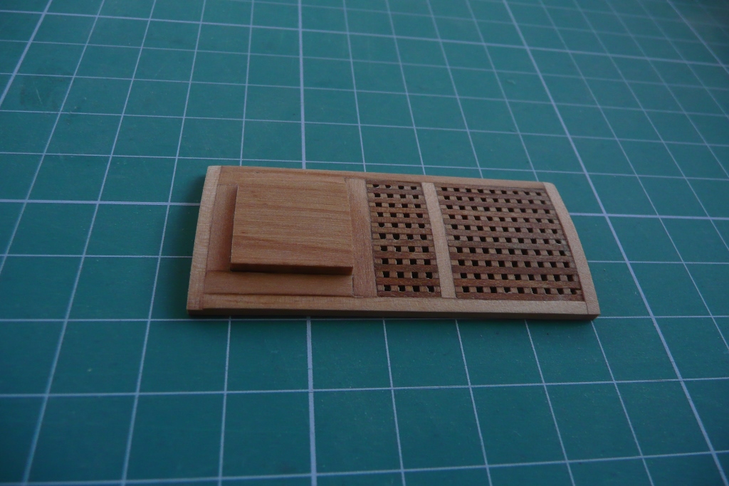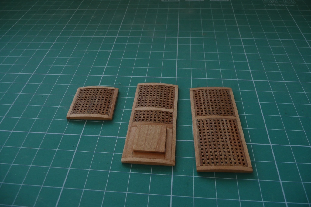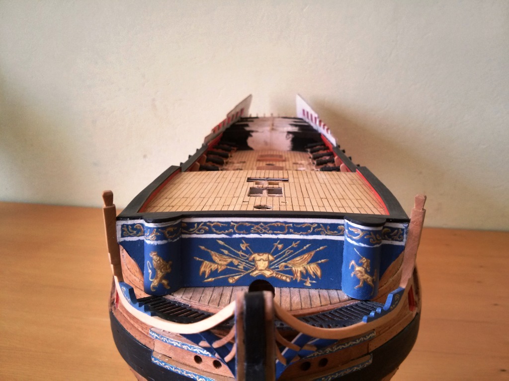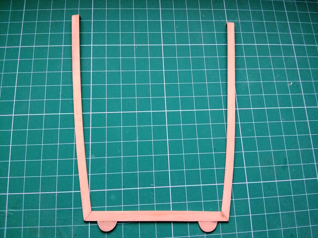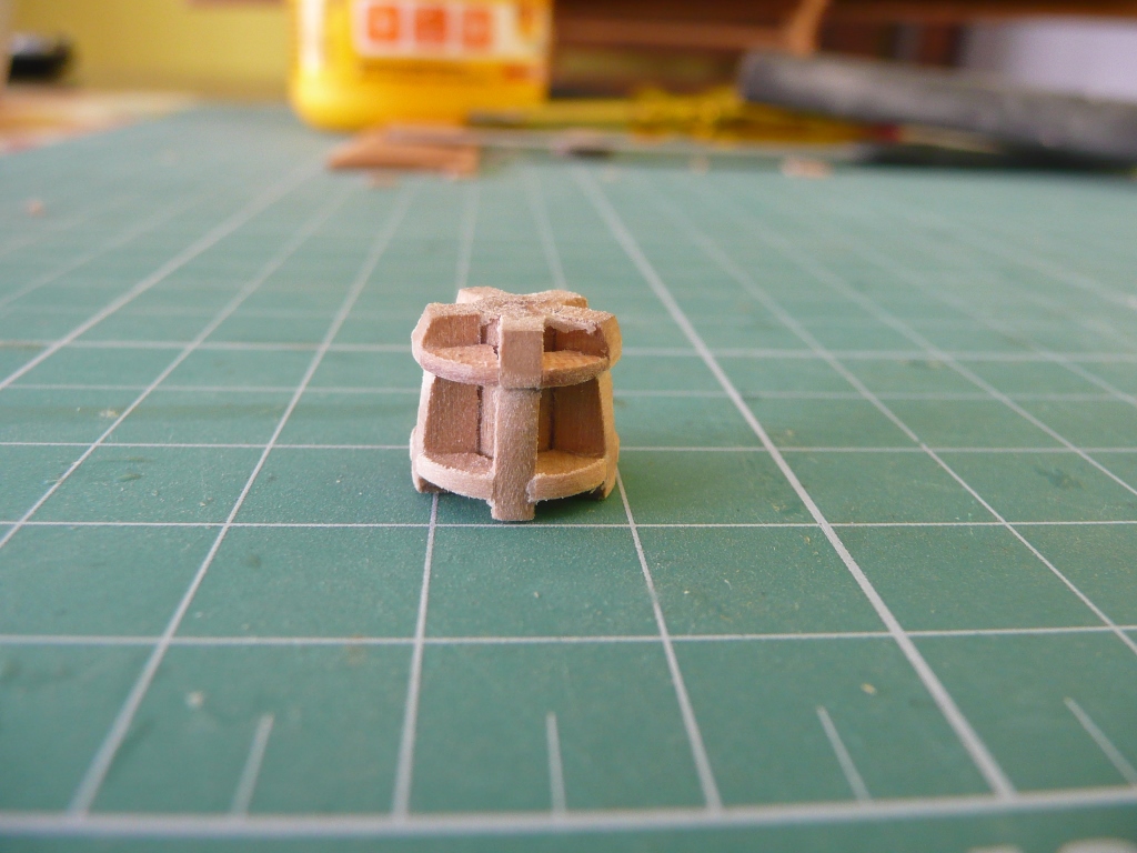 Wykonałem podpory pokładu rufowego z pasków forniru. Wg shipyardu były to 3 patyki nie trzymające rozmiarów. Zmodyfikowałem je troszeczkę wg poniższego zdjęcia. Prawdopodobnie jeszcze dodam rolki w otwory: