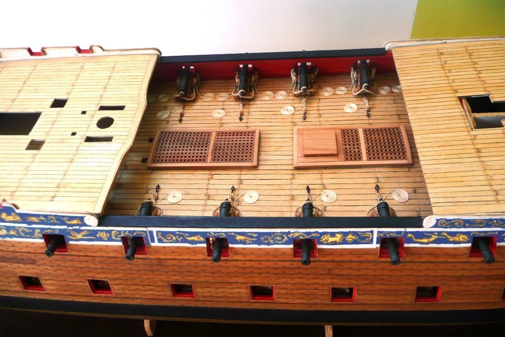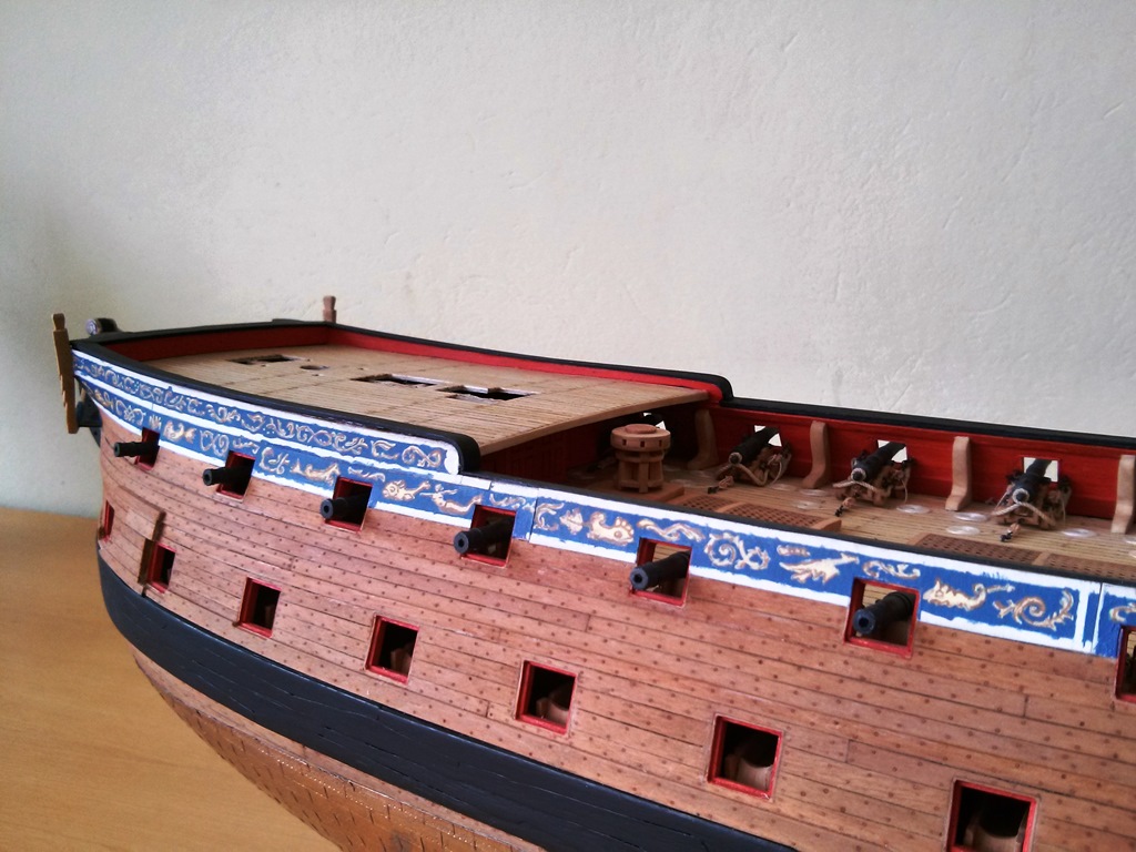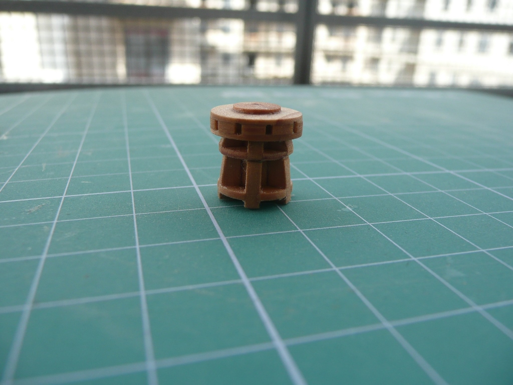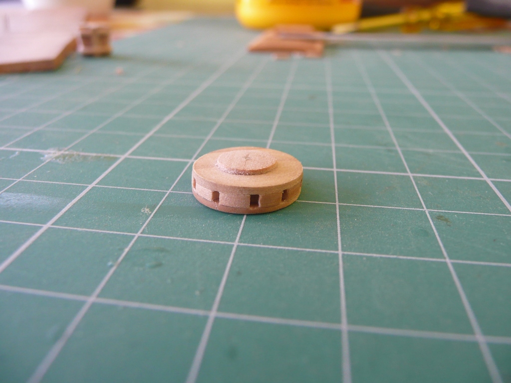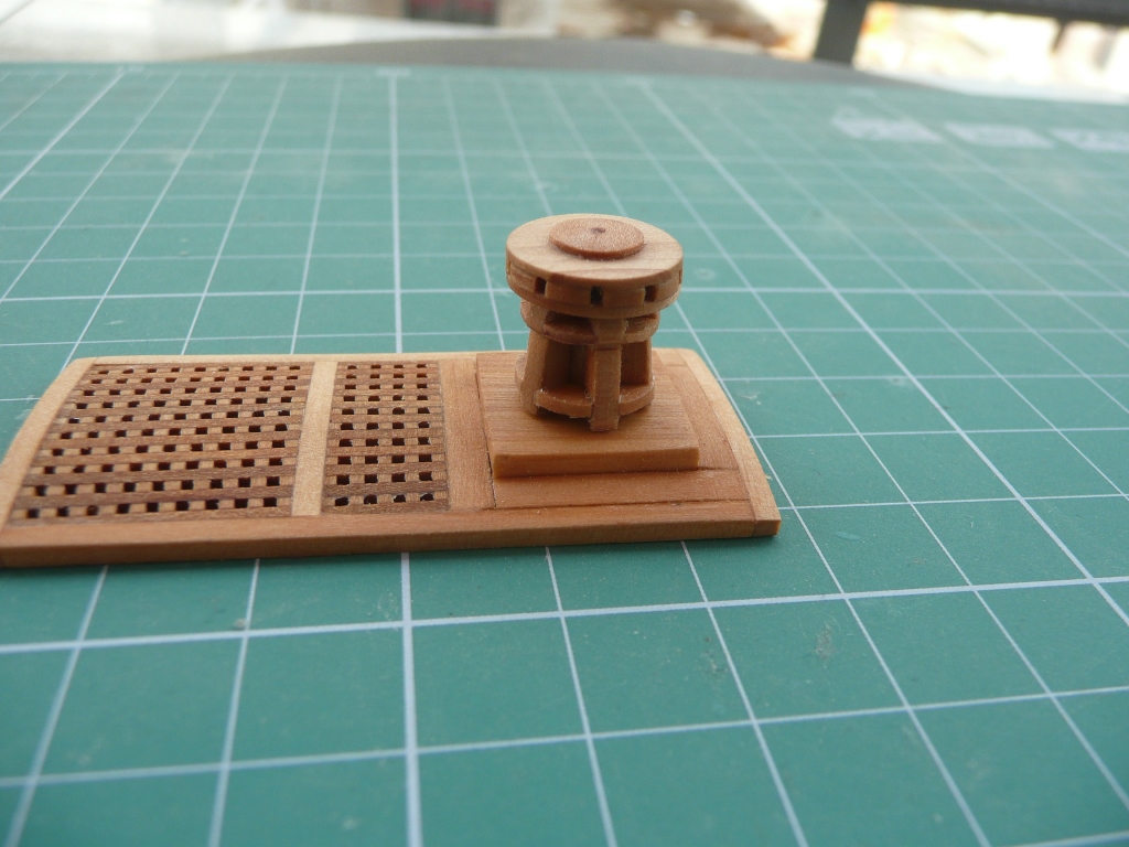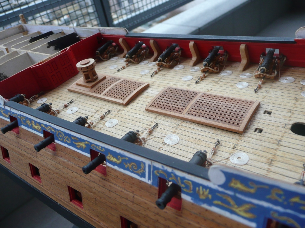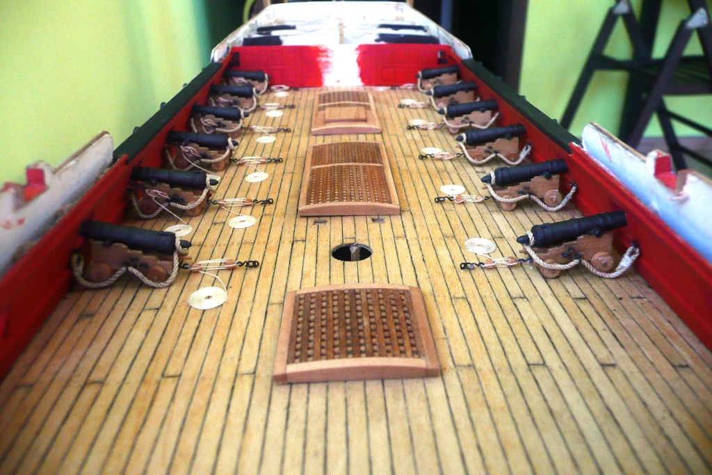Zrobiłem nowe grettingi. Na jednej burcie zostały również skończone lawety. Grettingi są na razie przymierzone.Obecnie pracuję nad kabestanem i tu mam dylemat czy malować na czerwono, czy zostawić w kolorze drewna?
