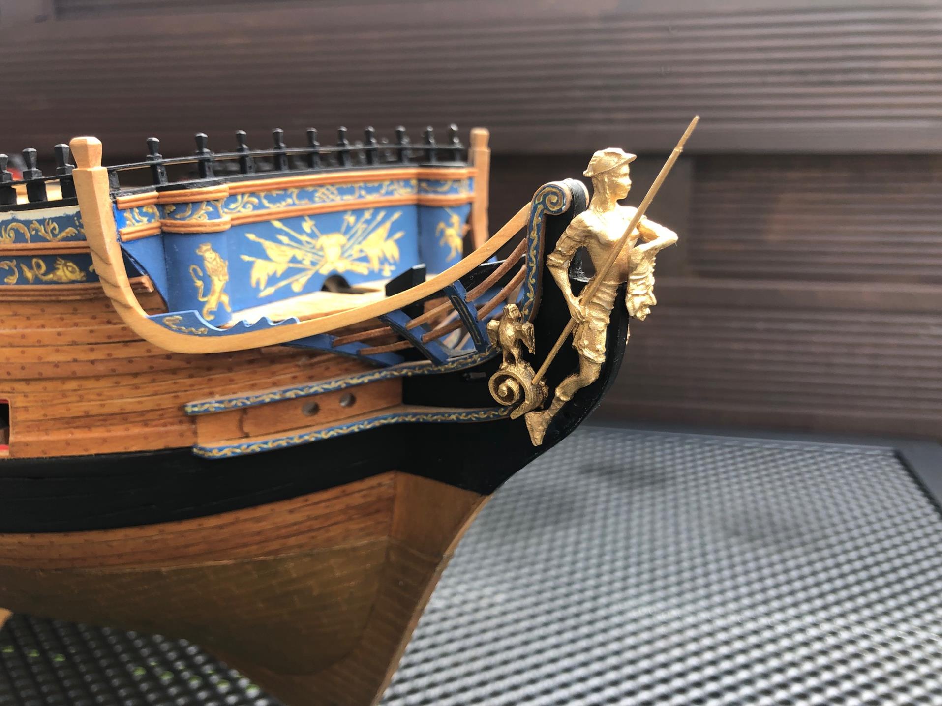 Prace przeniosły się na dziób okrętu. Doszła rzeźba. Paniusia włócznie ma wyjmowaną, bo pewnie nie raz by się złamała do końca budowy.