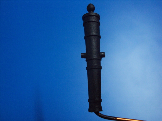 Nie bardzo wiedziałem jak zrobić końcówki armat, tak aby były identyczne ( chodzi o te "dzyndzle" gdzie mocuje się linę). Poradziłem sobie robiąc szablon w ostrzu nożyka do cięcia tapet, którym toczyłem owe elementy z wykałaczki: