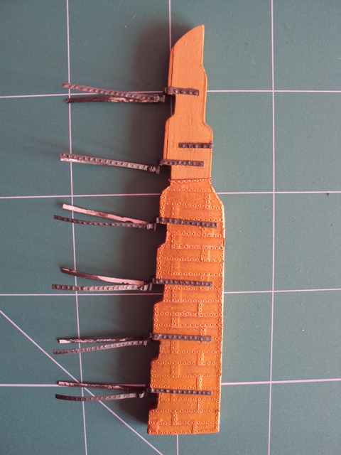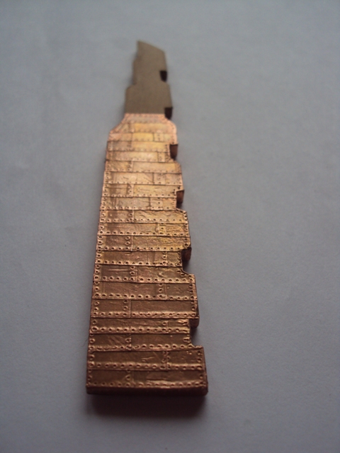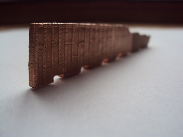 Dziękuję za miłe słowo. Zrobiłem ster, brak mu jeszcze okuć. Wykonałem go z kartonu, oklejonego fornirem. Miedź się spatynuje i jej odcienie się wyrównają. Wg Shipyardu, grubość steru powinna być jednakowa, taka jak grubość stępki. Przerobiłem to tak, jak jest pokazane w Anatomii Bellony, a mianowicie zeszlifowałem tylnią cześć, aby w przekroju patrząc od dołu przypominał trapez.