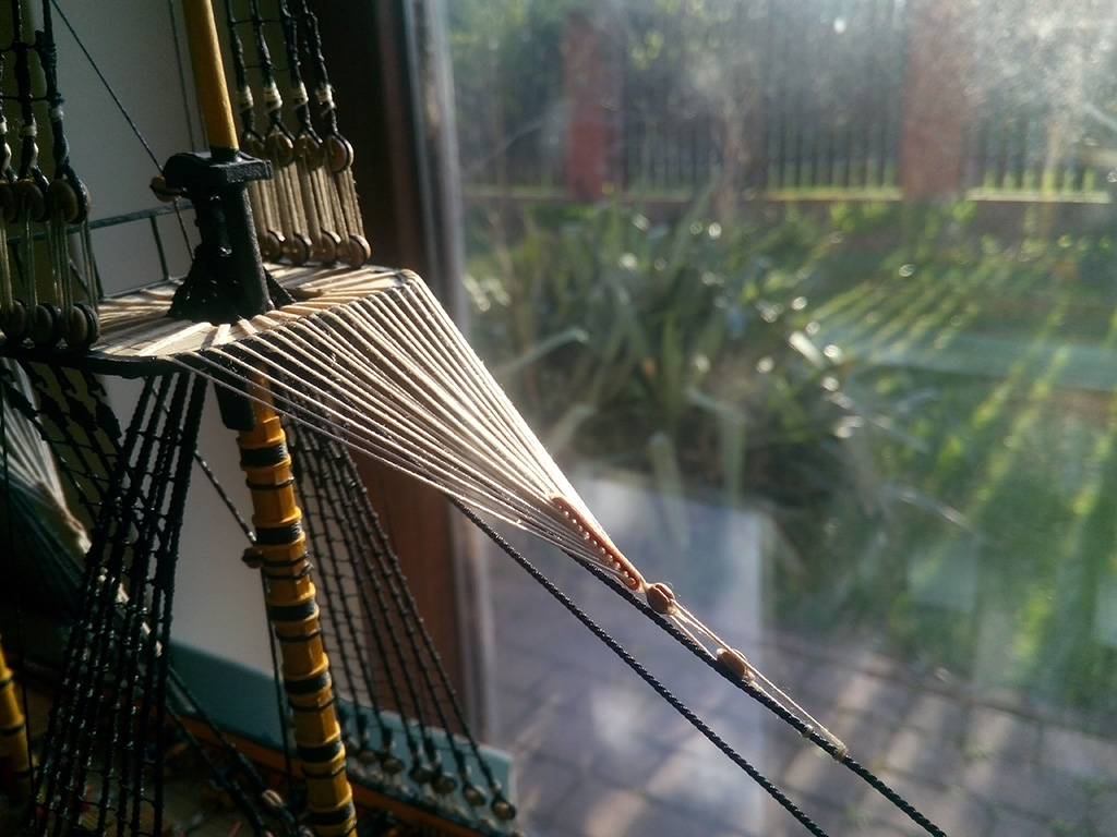 Prace cały czas postępują, chociaż są mało widoczne - musiałem zawiesić dużą liczbę bloczków na masztach, salingach i marsach, potrzebnych do mocowania rej i żagli.