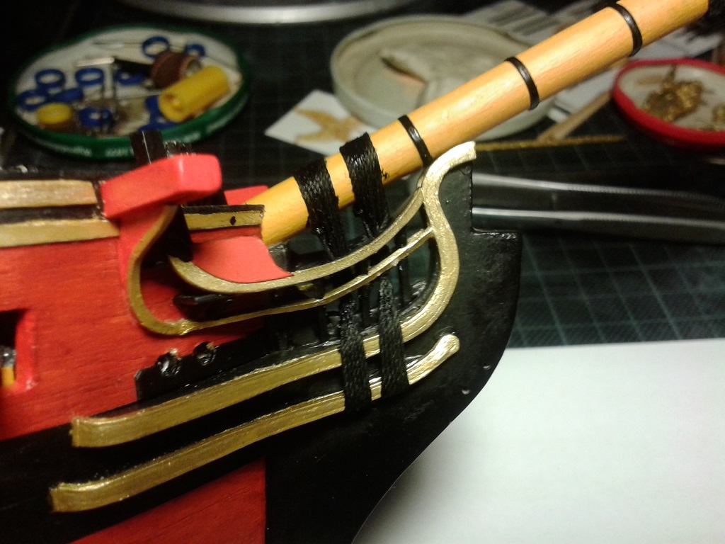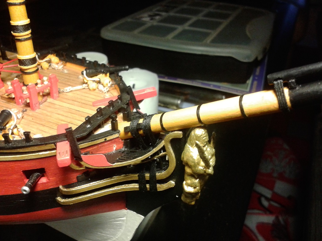Prace przy olinowaniu bukszprytu - watersztagi i wanty. Wanty mocowane są do burt za pomocą haków. Zastosowałem serca do łączenia want i watersztagów z bukszprytem