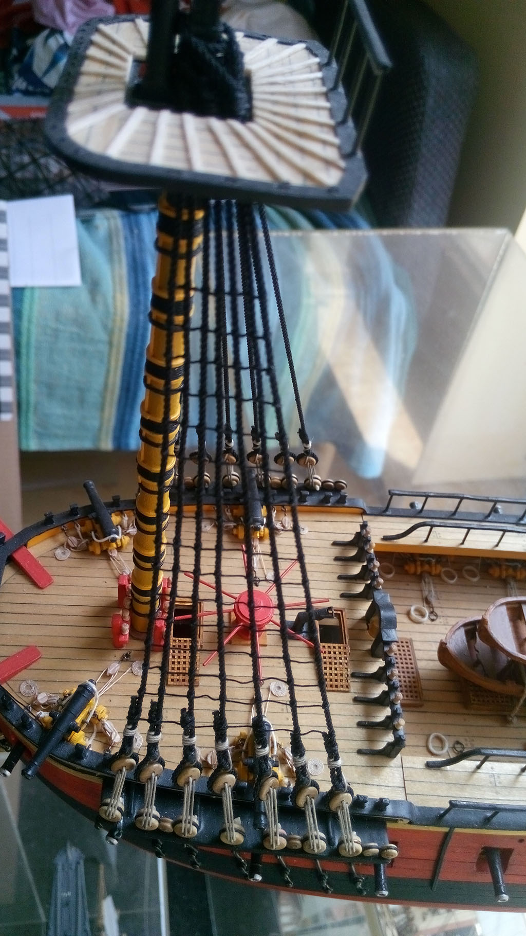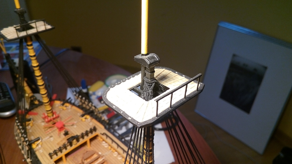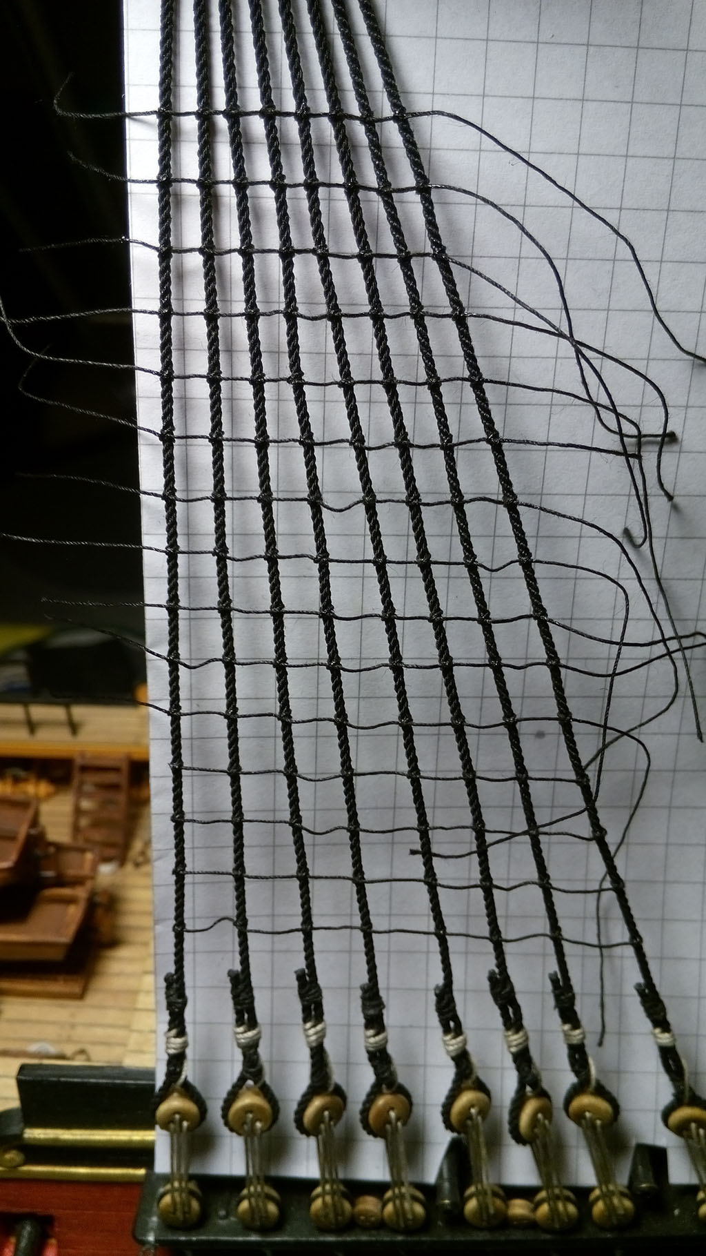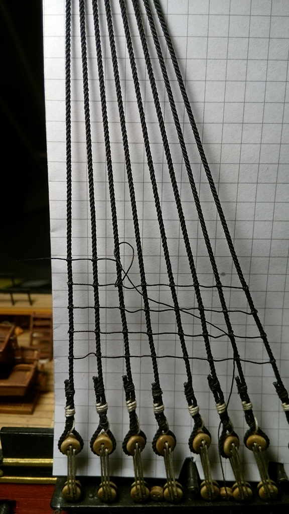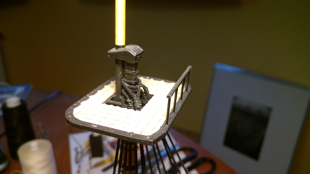 Skończyłem montować wanty pierwszego piętra, poprawiłem błędne ułożenie jufersa. Wiązania będą jeszcze malowane czarną farbą.