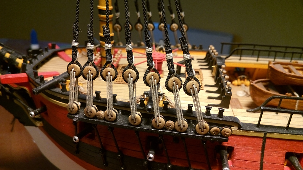 Po pierwsze; podziwiam przepiękną pracę (zresztą wszystkie prezentowane w relacjach modele są na światowym poziomie), po drugie zaś; wyblinki są wiązane równolegle do płaszczyzny wody. Nie chodzi przecież, by było ładnie, tylko by wygodnie (w miarę) można było wejść na górę i poszarpać się z żaglami.